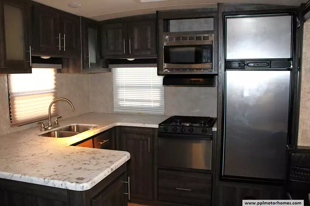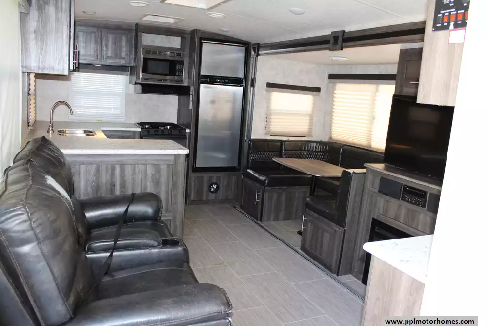 2018 Open Range 2804RK, a beautifully designed rear kitchen travel trailer that blends residential feel with road-ready versatility. The spacious rear kitchen offers abundant counter space, ample cabinetry, and a layout that makes cooking and entertaining effortless, while the large slide-out opens up the living area for a bright, inviting atmosphere. With theater seating or sofa options, a U-shaped dinette, and an entertainment center, this unit creates the perfect space to relax after a day of adventure.