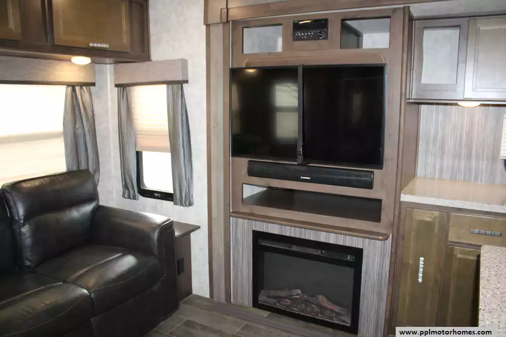 The 2018 Open Range 323RLS is a spacious and well-equipped travel trailer designed for comfortable family or couple adventures, featuring a generous triple-slide layout that expands the living space and enhances interior comfort. With a large rear living and kitchen area that includes theatre seating, a free-standing dinette, kitchen island with double sink, and an entertainment center with fireplace, it's ideal for relaxing and entertaining on the road; the full galley also offers ample storage, a three-burner cooktop, microwave and refrigerator. A centrally located bath with shower and vanity separates the living area from the private front bedroom, which boasts a king-size bed slide and plenty of wardrobe storage with a washer/dryer combo . Built on a robust 100" wide-body frame with the ACCU-SLIDE slide system and solid construction features, the 323RLS combines residential-style touches and practical amenities to support extended stays or weekend getaways.