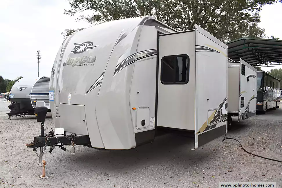 This 2018 Jayco Eagle 330RSTS has an Electric Tongue Jack, 3 Slide-outs, 2 Ducted Air Conditioners, Double Door Gas/12v Norcold Refrigerator, Automatic Main Awning, Outside Speakers, 2 TVs, Outside Shower, Fireplace, Microwave, 3 Burner Range, Oven
