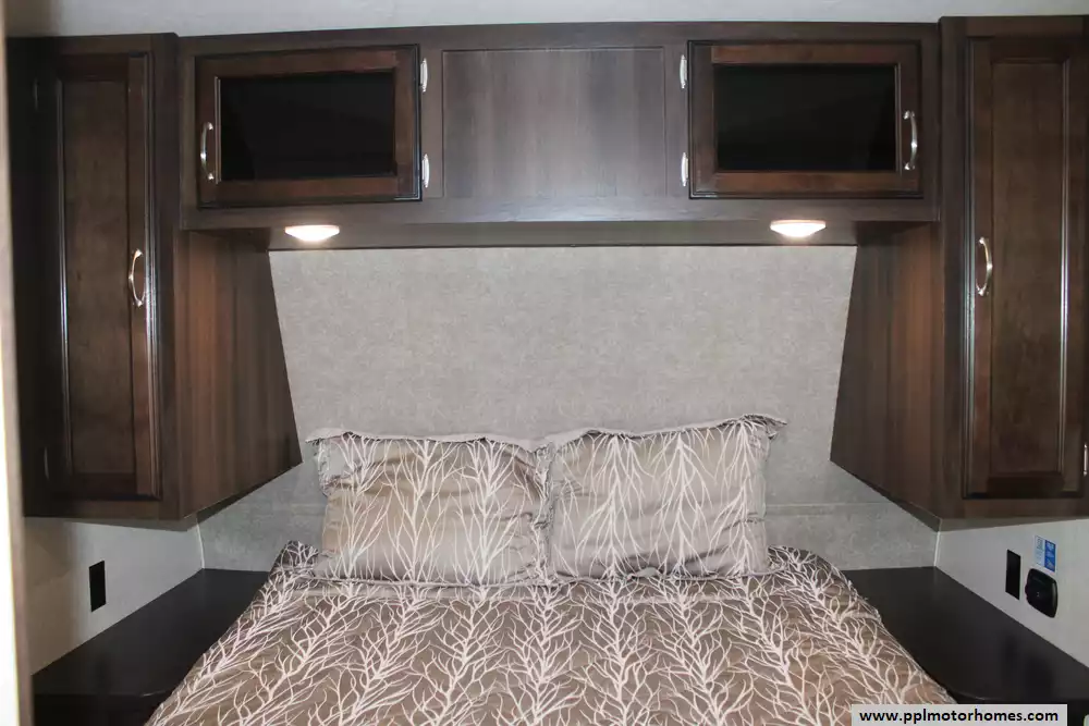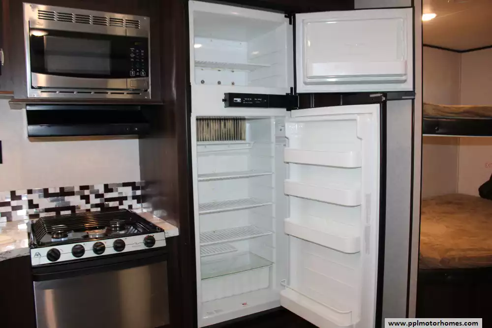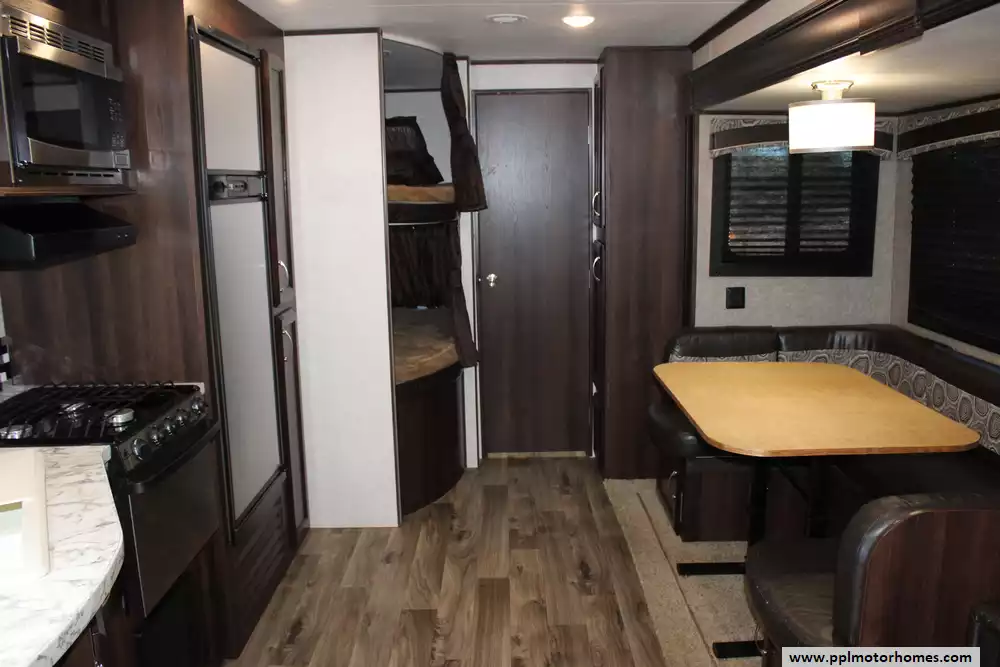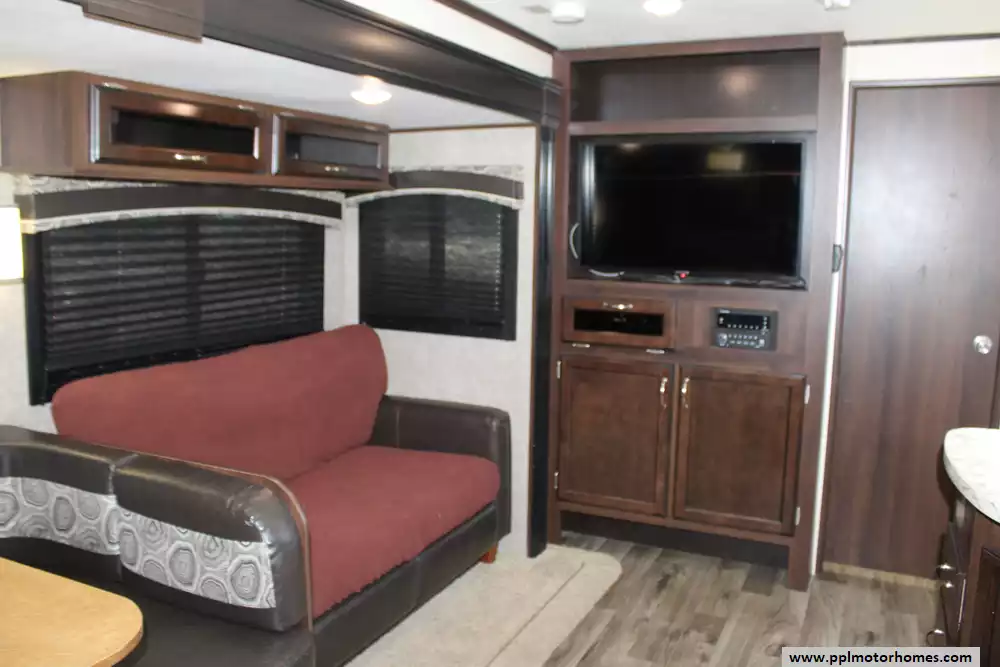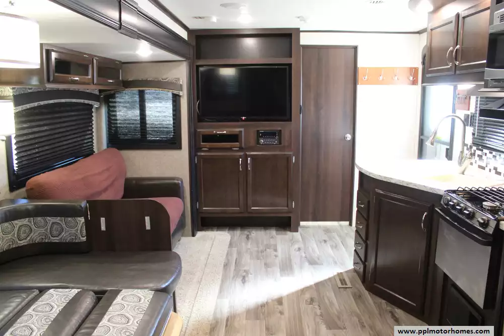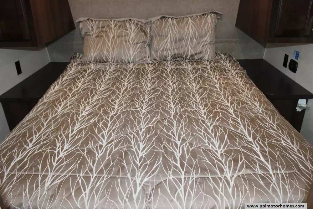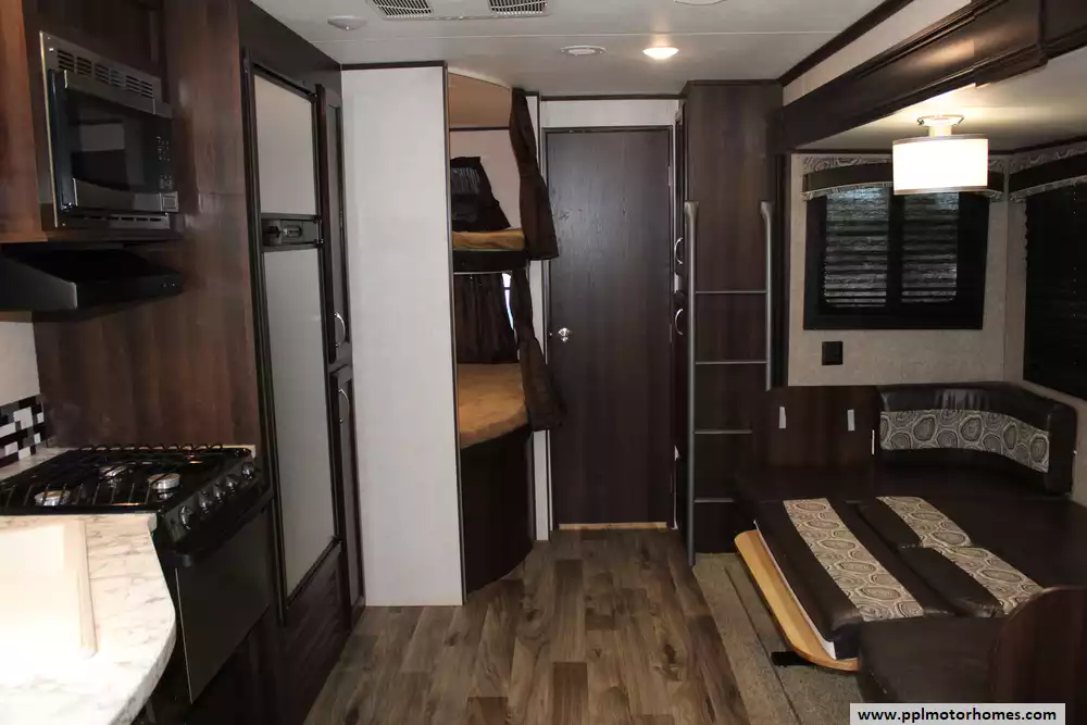 Specs: Length: 34.2 ft., Width: 8 ft., Height: 11.08 ft., Interior Height: 6.75 ft., Payload Capacity: 2,450 lbs., Total Fresh Water Tank Capacity: 76 gal., Total Gray Water Tank Capacity: 78 gal., Total Black Water Tank Capacity: 78 gal.