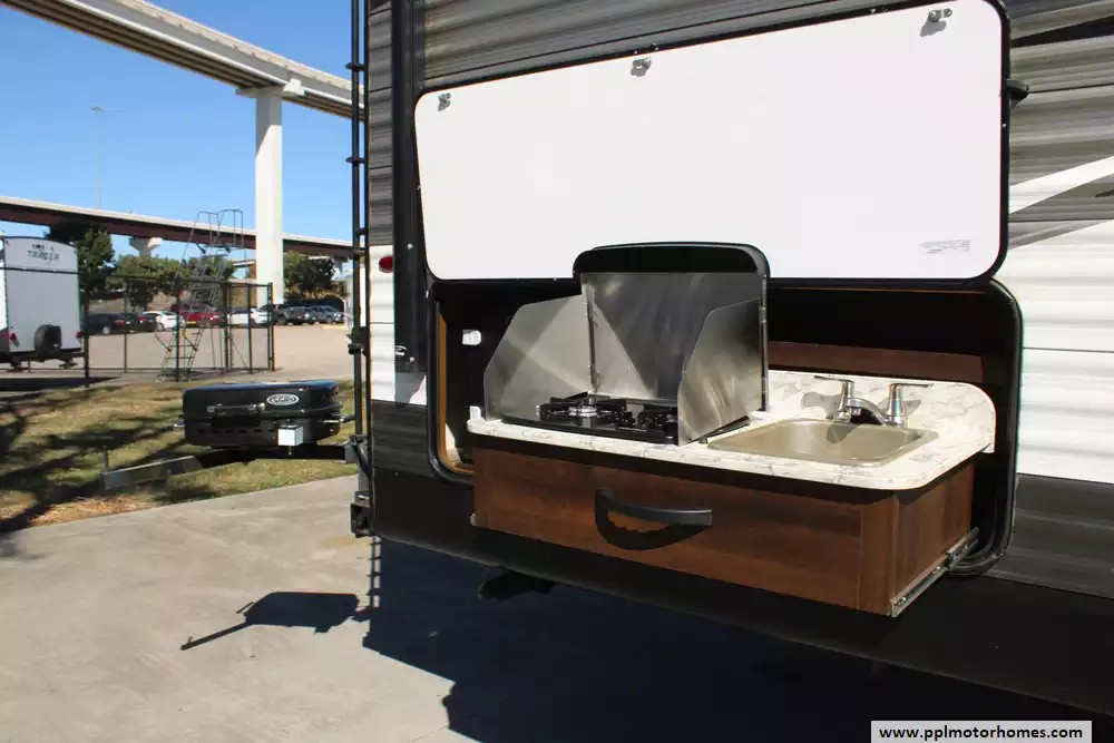 If you're looking for a well-equipped, larger travel trailer with a layout that supports a family or guests this 2018 Jayco Jay Flight 29BHDB is a strong candidate. Features Include...Electric Tongue Jack, 1 Slide-out, 1 Non-Ducted And 1 Ducted Air Conditioner, Double Door Gas/110v Norcold Refrigerator, Automatic Main Awning, Outside Speakers, 2 TVs, Outdoor Grill, Outdoor Kitchen, Outside Shower, Microwave, 3 Burner Range, and Oven.
