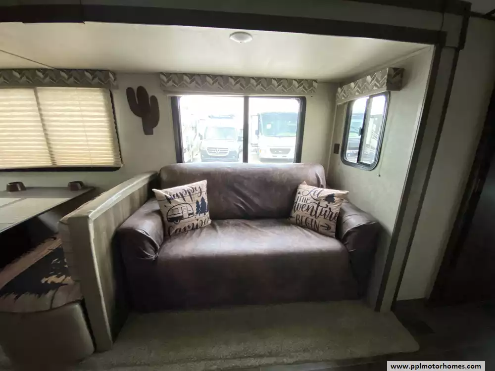 The interior is designed for maximum comfort and convenience, featuring a dual-AC system with one ducted and one non-ducted unit to ensure total climate control during summer trips. The chef-inspired kitchen is fully equipped with a three-burner range, oven, microwave, and a double-door gas/electric Dometic refrigerator to handle all your meal prep needs. For entertainment, the cabin includes two TVs and a DVD player, providing multiple viewing areas for the whole family. Whether you are relaxing in the spacious living area or the private bunkhouse, the premium finishes and thoughtful layout make every trip feel like a getaway.