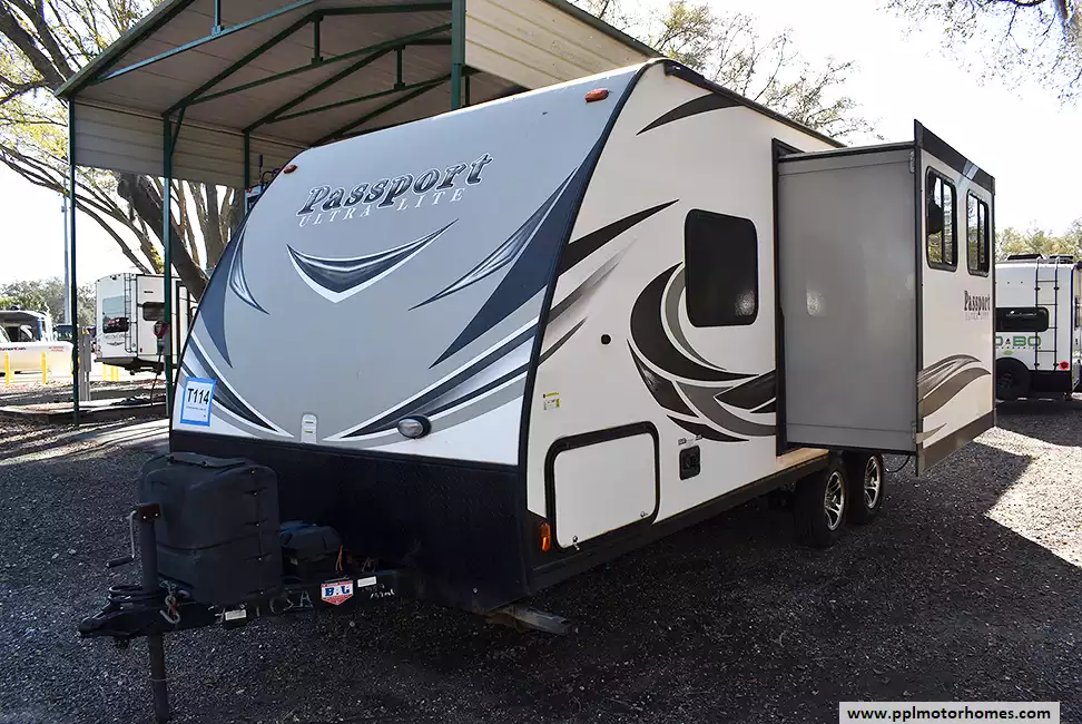 This 2018 Passport Ultra Lite 199ML has an Electric Tongue Jack, 1 Slide-out, 1 Ducted Air Conditioner, Double Door 110v/12v Dometic Refrigerator, Automatic Main Awning, Outside Stereo, TV, Outside Shower, Microwave, 3 Burner Range, Oven and outside grill