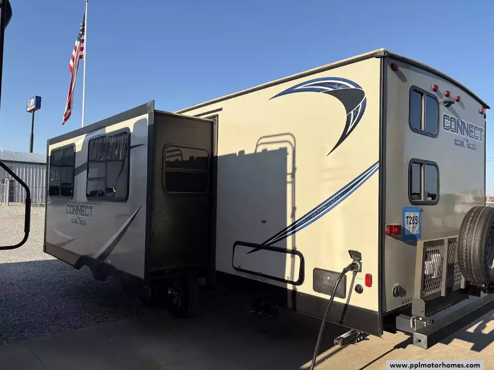 This 2018 Connect 281BH sleeps up to 10 people, has an Electric Tongue Jack, 1 Slide-out, 2 Ducted Air Conditioners, Double Door Gas/110v Norcold Refrigerator, Automatic Main Awning, Outside Speakers, 2 TVs, DVD Player, Outdoor Grill, Outside Shower, Microwave, 3 Burner Range, and Oven