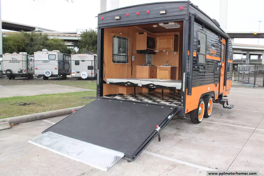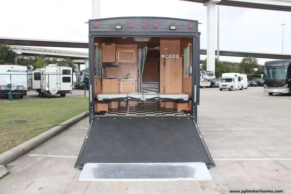 Someone who wants a toy hauler but doesn't need a massive, heavyweight garage this 2018 Retro 820R is ideal for small ATVs, bikes, or just extra cargo. Features Include...1 Non-Ducted Air Conditioner, Double Door Gas/110v Dometic Refrigerator, Automatic Main Awning, Outside Shower, Microwave, and 2 Burner Range.