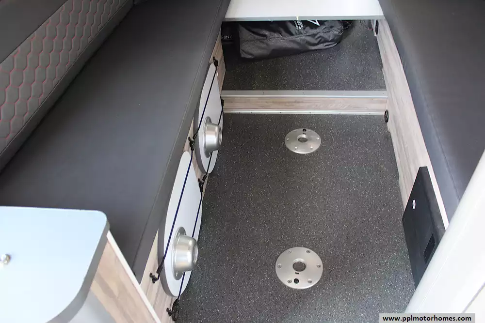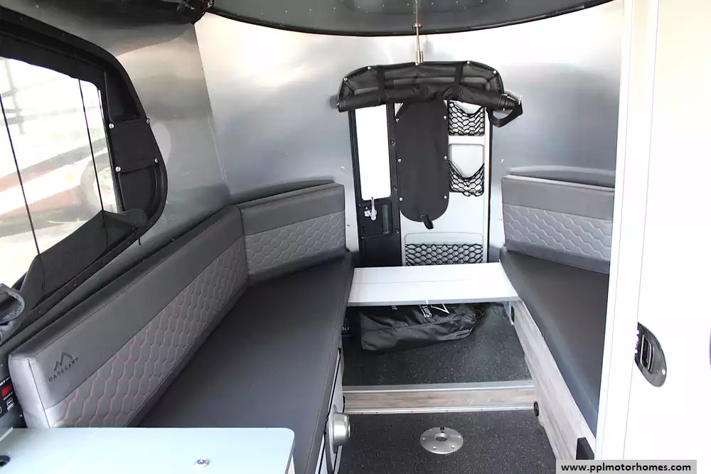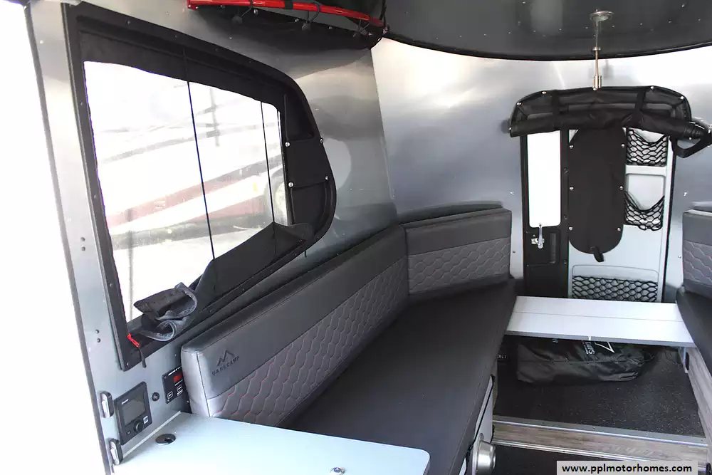 Inside, the smart floorplan maximizes space with a convertible rear seating area that transforms into a comfortable bed. Large panoramic windows flood the cabin with light and views, while the galley kitchen includes a two-burner cooktop, sink, and storage. The wet bath with toilet and shower ensures comfort on the go, and the rear hatch makes loading bikes, kayaks, or gear simple. Durable, easy-clean materials keep it looking fresh trip after trip.