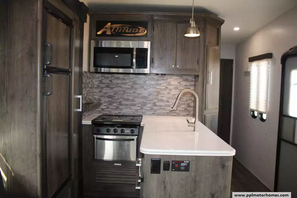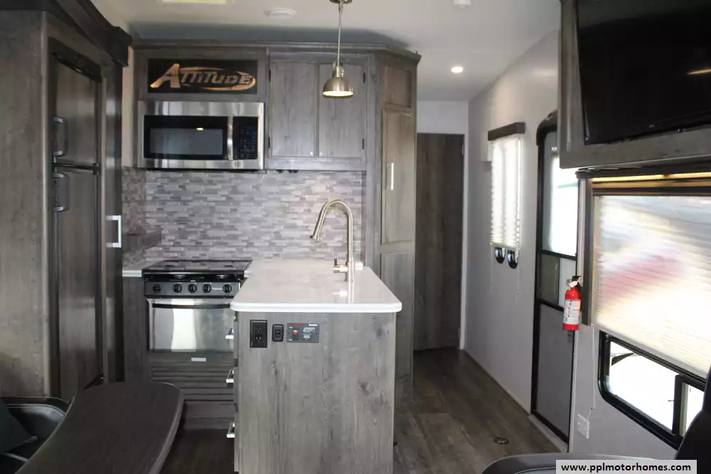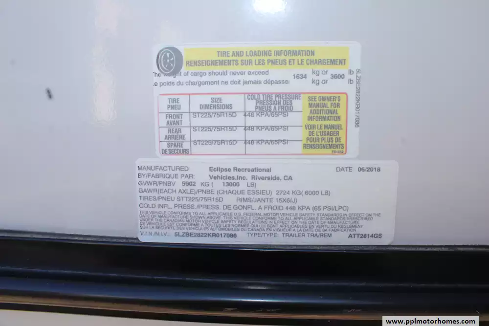 The 2019 Eclipse Attitude Wide Lite 2814GS is a rugged yet comfortable toy hauler built for those who want both adventure and livability. At about 35 feet long and offering a GVWR of roughly 13,000 lbs with a dry weight near 9,400 lbs, it features a single slide-out, a queen bedroom up front, and a spacious cargo garage in back (nearly 19 feet on one side) that doubles as additional sleeping and lounging space thanks to an electric bed and convertible dinette arrangements. You'll find substantial fresh water capacity (150 gallons), twin LPG tanks, a 15,000 BTU air conditioner, and a 30,000 BTU furnace, enough to handle both hot summer afternoons and chilly nights. Exterior features like a 40-gallon fuel station, an electric awning with LED lighting, and a ramp door capable of hauling off-road gear make it well suited for off-grid travel and hauling toys. Conquer your adventures and bring some "Attitude" to your camping lifestyle!
