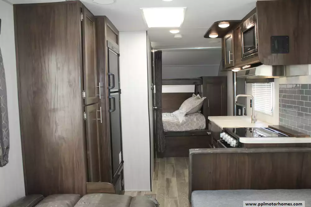Setting up camp is effortless thanks to the electric tongue jack and the automatic main awning that creates an instant outdoor living space. You can enjoy the fresh air with the convenience of an outside shower and integrated outside speakers for your favorite tunes. Inside, the well-appointed kitchen is ready for any meal with a three-burner range, oven, microwave, and a double-door gas/110v Dometic refrigerator. Whether you are cooling down with the non-ducted air conditioner after a long hike or relaxing in the spacious interior, this Grey Wolf 19SM provides everything you need for unforgettable adventures on the road.