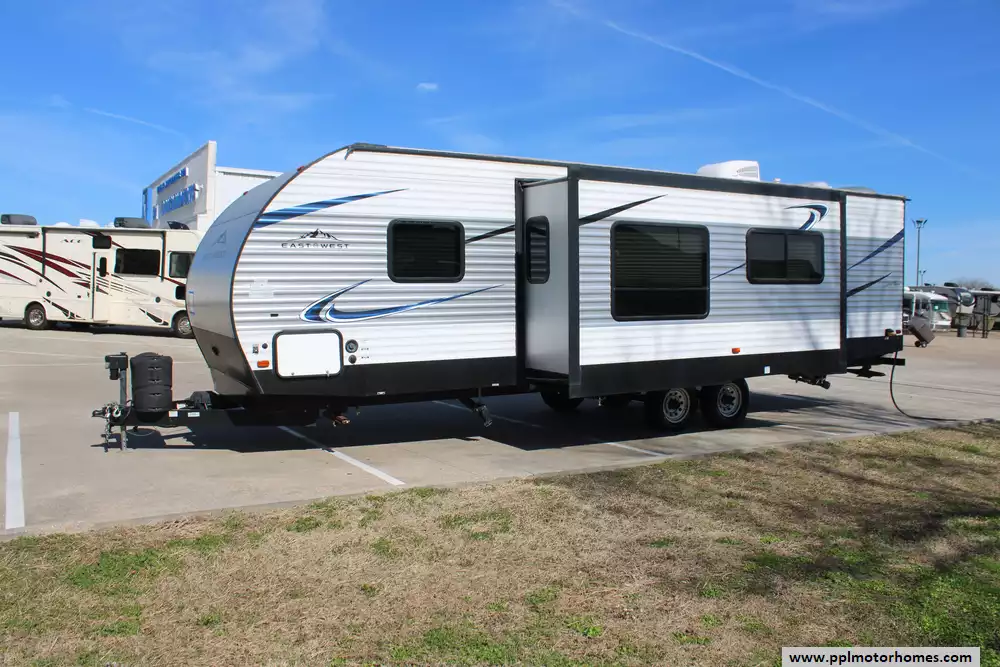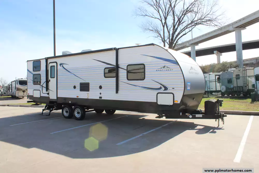 This 2019 East To West Della Terra 28KRD is a spacious and well-equipped travel trailer designed for families and adventurers seeking comfort and convenience on the road. With its thoughtful layout, modern amenities, and durable construction, it offers a perfect blend of style and functionality for extended vacations or weekend getaways.Features Include...Electric Tongue Jack, 1 Slide-out, 1 Ducted Air Conditioner, Double Door Dometic Refrigerator, Automatic Main Awning, Outside Speakers, TV, Outside Shower, Microwave,3 Burner Range,and Oven.It offers a luxurious and comfortable travel experience for families and adventurers alike. With its spacious interior, modern amenities, and durable construction, it's the perfect home away from home for your next outdoor adventure.