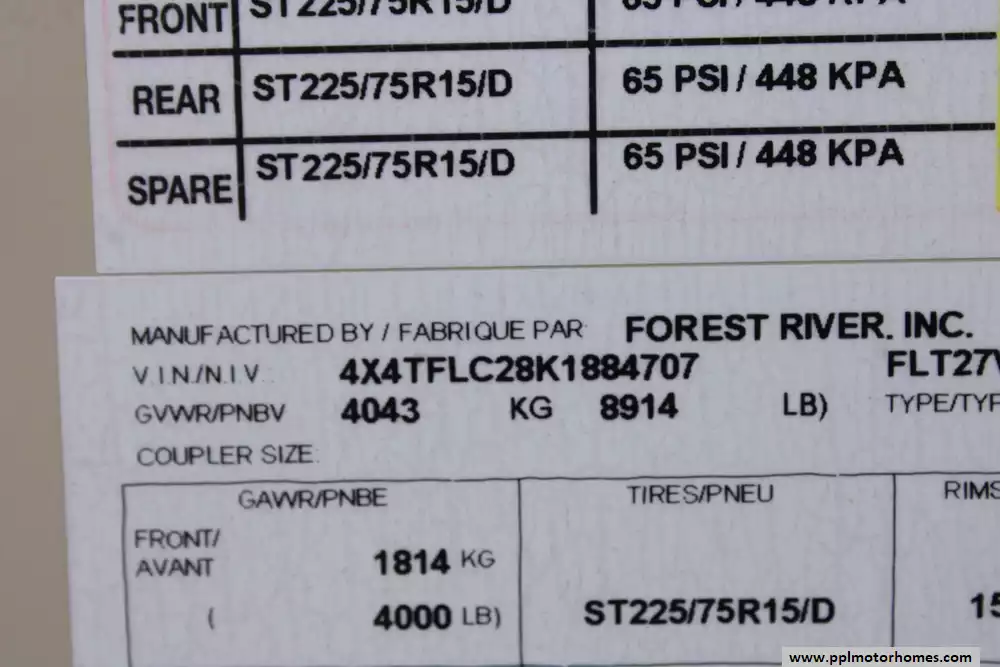 Specs: Length: 32.92 ft., Height: 12.25 ft., Payload Capacity: 1,900 lbs., Total Fresh Water Tank Capacity: 56 gal., Total Gray Water Tank Capacity: 78 gal., Total Black Water Tank Capacity: 39 gal., Number of Propane Tanks: 2, Total Propane Tank Capacity: 60 lbs.