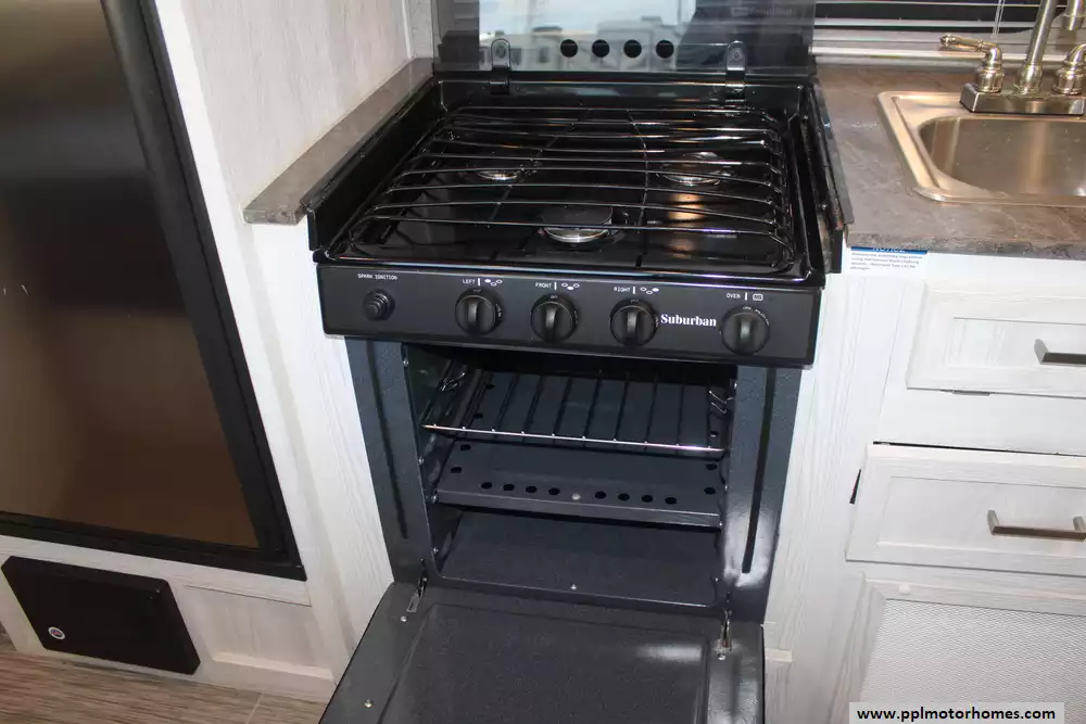 Inside, the G19FD cleverly maximizes space and comfort for up to three campers. The front Murphy bed folds away during the day to reveal a cushioned 72" sofa, and by night it transforms into a cozy full-size sleeping area. A 32" booth dinette offers both dining space and an additional sleeping surface, ideal for a child or small guest. The rear full bathroom includes a tub/shower, toilet, large linen closet, and water-saving shower miser, a thoughtful touch for longer stays. The central galley features a 3-burner stove, mid-size fridge (12V/electric/propane), convection microwave, and exterior griddle hookup.
