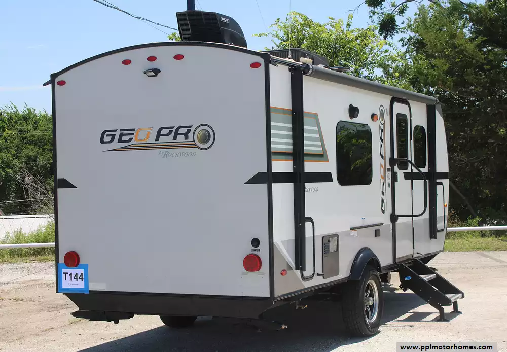 On the outside, you'll appreciate the 14' power awning, pass-through storage, exterior griddle, and sleek aerodynamic fiberglass body with tinted frameless windows. Optional upgrades like solar panels (200 W stock, expandable), lithium battery/inverter power pack, an 11,000 BTU A/C with soft-start, and off-road Mud-Rover tires add more self-sufficiency and rugged capability . Altogether, the 2019 Geo Pro G19FD is a nimble, adventure-ready travel companion that offers comfortable sleeping for two adults (plus one guest), easy towing with midsize rigs, and versatile features perfect for weekend camping or extended road trips.