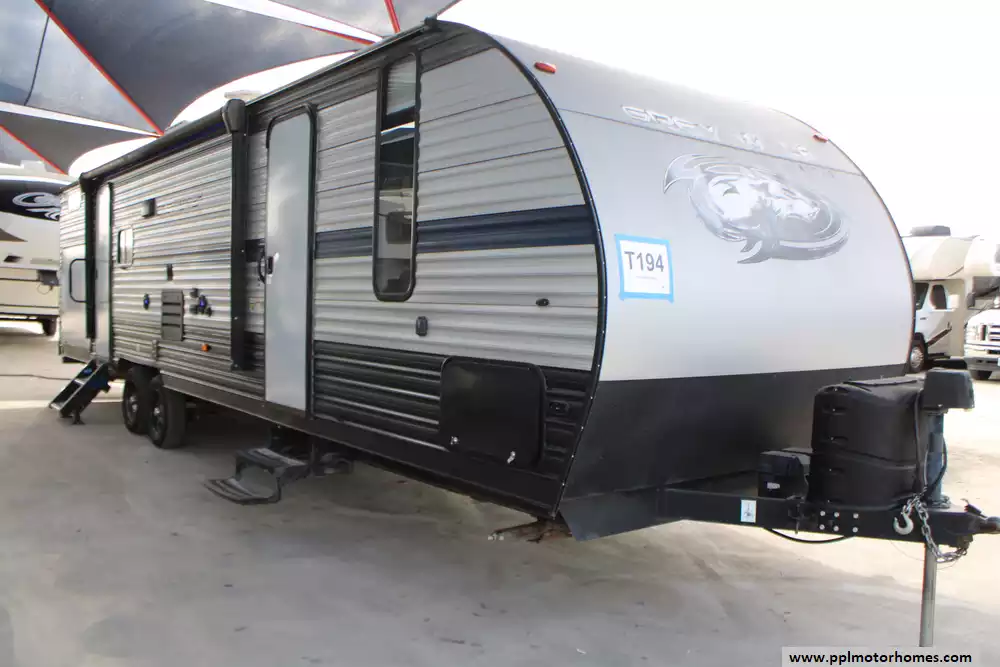 This 2019 Grey Wolf 29TE has an Electric Tongue Jack, 1 Slide-out, 1 Ducted Air Conditioner, Double Door Gas/110v Norcold Refrigerator (Additional Refrigerator Present), Stand-Alone Ice Maker, Automatic Main Awning, Outside Speakers, TV, Outdoor Kitchen, Outside Shower, Microwave, 3 Burner Range, Oven