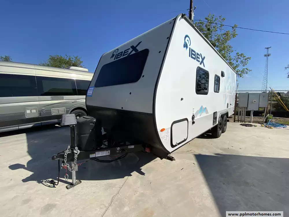 This 2019 Ibex 19MBH has an Electric Tongue Jack, 1 Non-Ducted Air Conditioner, Double Door 12v Norcold Refrigerator, Automatic Main Awning, Solar Panel, TV, Outdoor Grill, Outdoor Kitchen, Outside Shower, 2 Burner Range