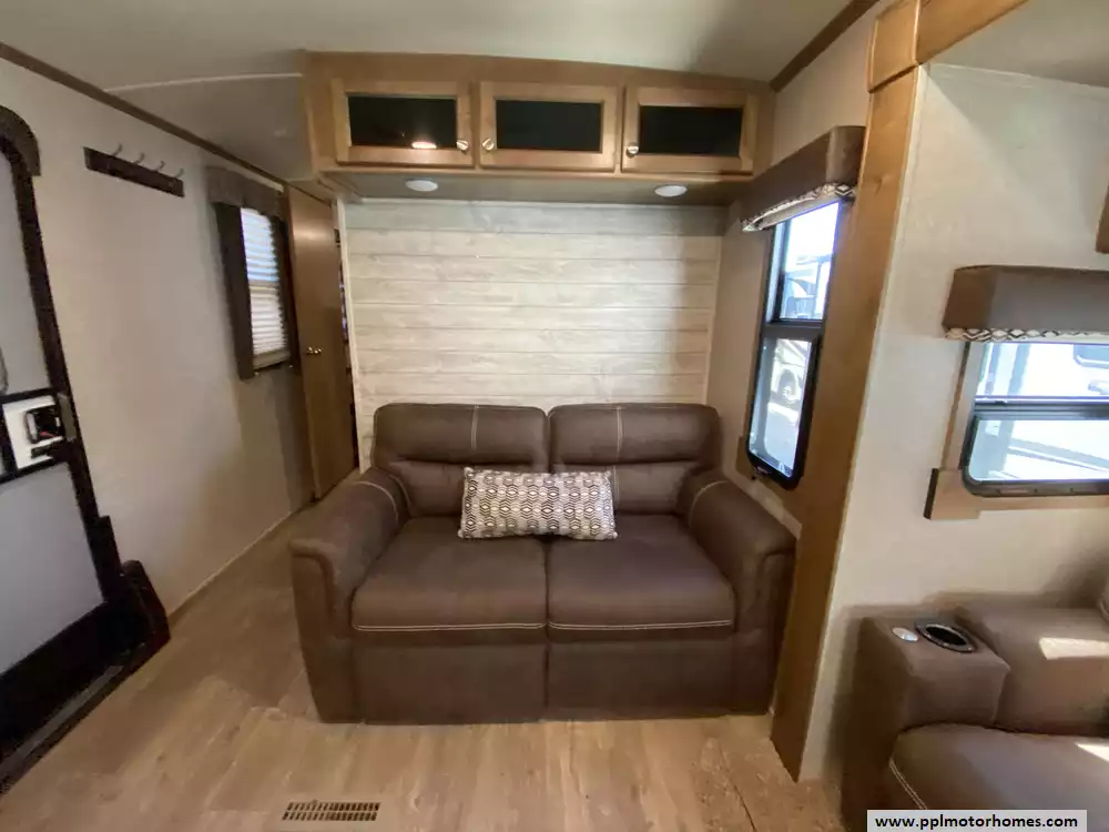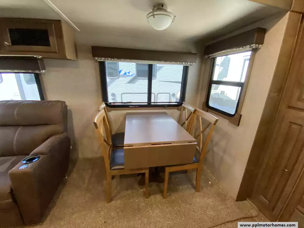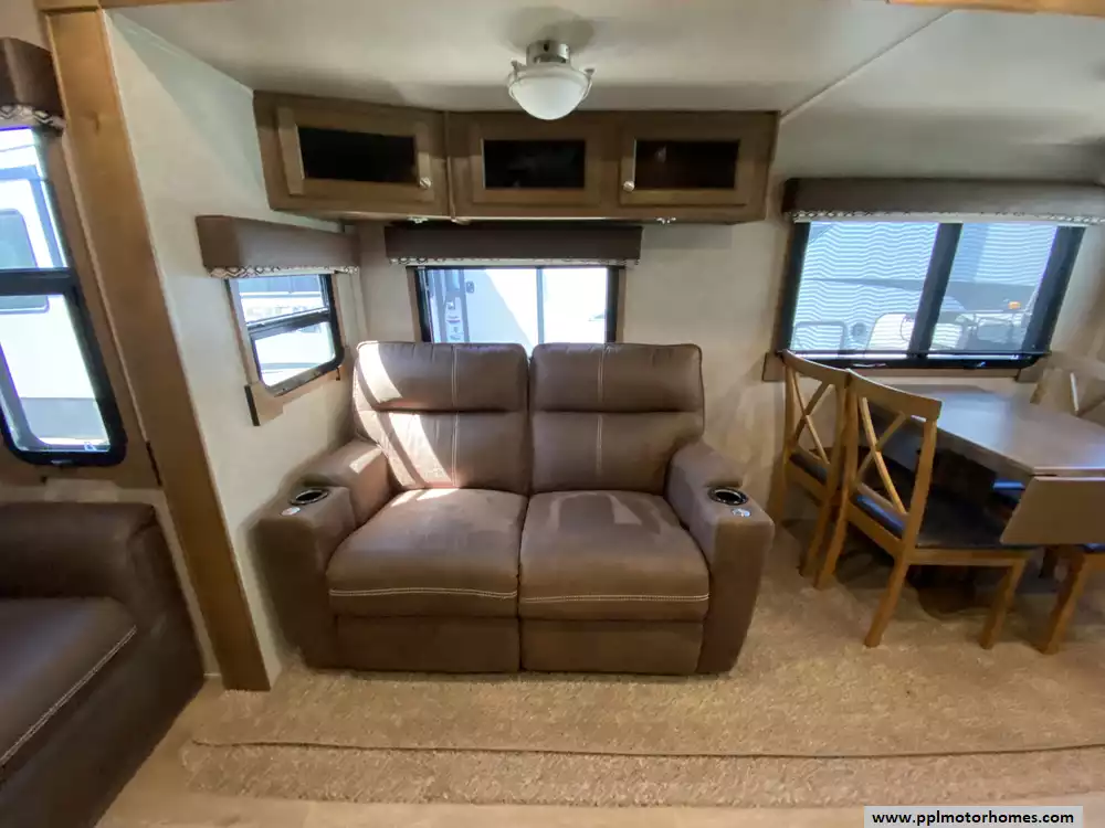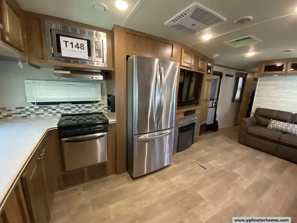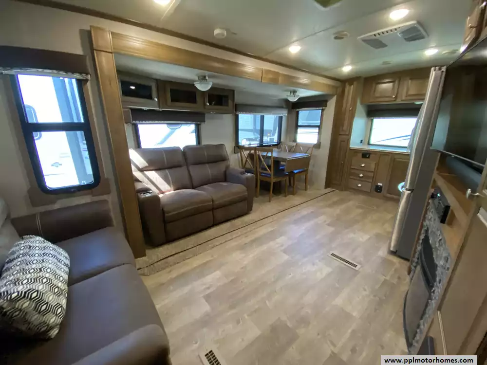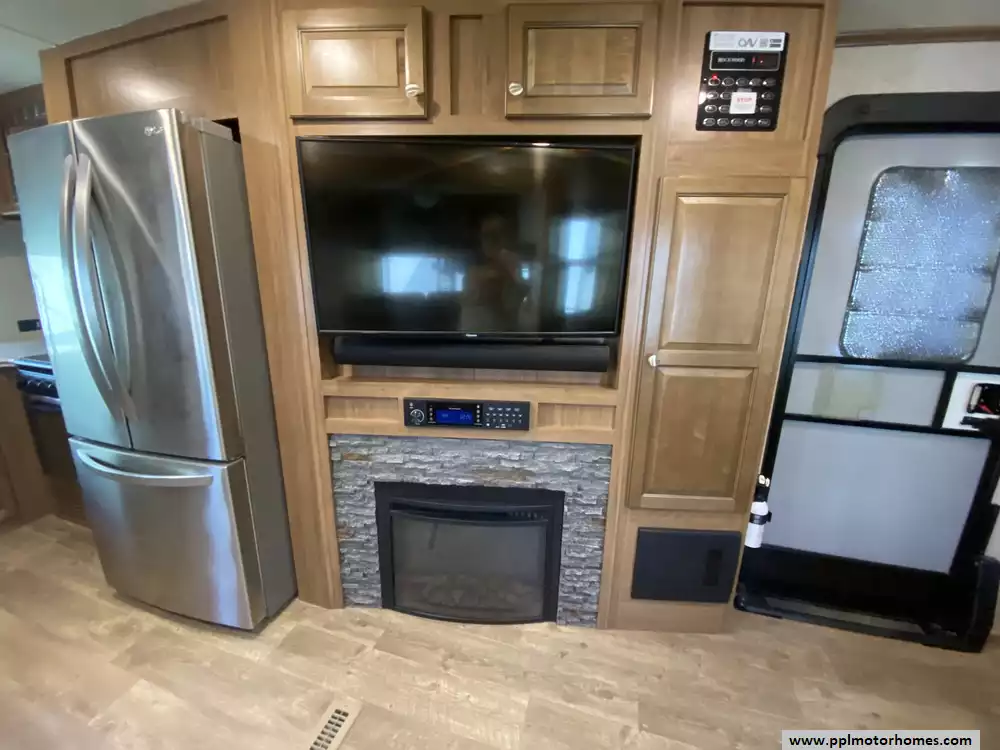 Experience the ultimate in residential-style travel with this 2019 Rockwood Signature Ultra Lite 8335BSS. Renowned for its superior six-sided aluminum frame and vacuum-bonded fiberglass construction, this 35-foot trailer offers a high-end feel usually reserved for luxury fifth wheels. The standout feature is the expansive front kitchen, which boasts a stunning panoramic front window and massive counter space, perfectly complemented by a three-burner range, oven, microwave, and a double-door 12v residential LG refrigerator with a built-in ice maker. The open living area is anchored by dual slide-outs and a cozy fireplace, creating an inviting atmosphere for relaxation or entertainment with the included TV and DVD player.