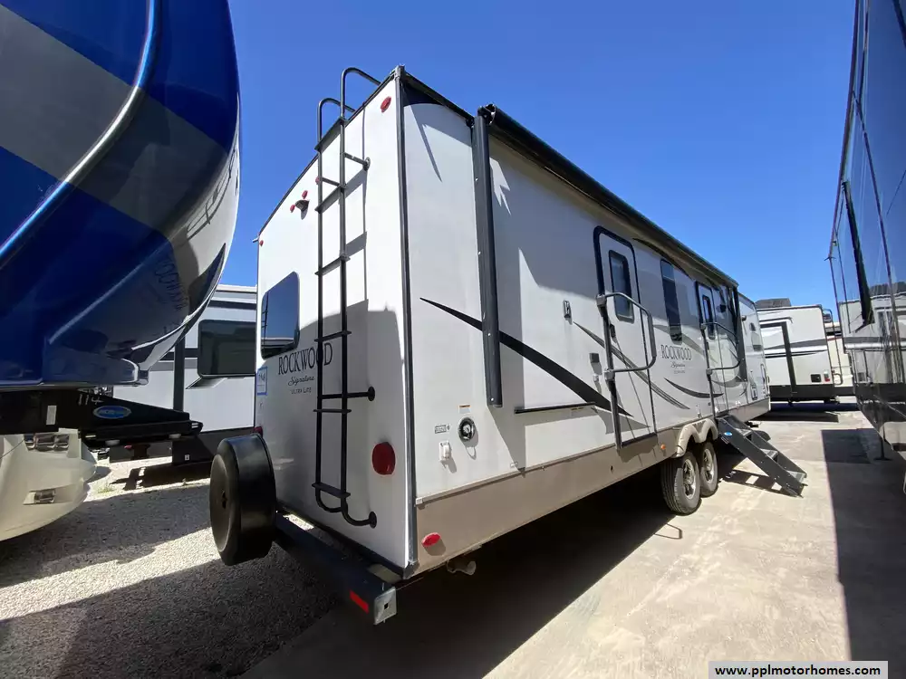 Designed for extended stays and all-season comfort, this model features thermostatically controlled heated tanks and two ducted air conditioners to keep the climate perfect in any environment. The private rear bedroom offers maximum convenience with dedicated washer and dryer connections, while the durable TPO roof ensures long-term peace of mind. Setting up your campsite is effortless thanks to the electric tongue jack and automatic main awning. You can fully enjoy the outdoors with the integrated outdoor grill, outside shower, and external speakers. With its reputation for premium craftsmanship and thoughtful design, this Rockwood Signature is a sophisticated home on wheels ready for your next adventure.