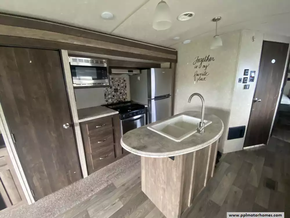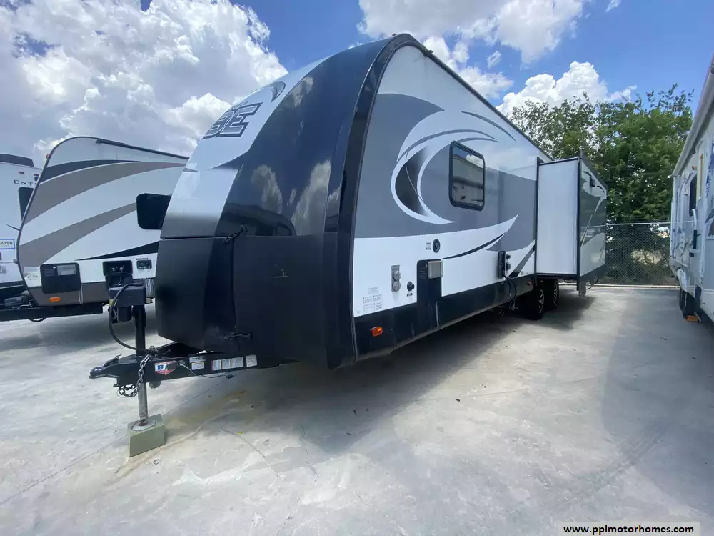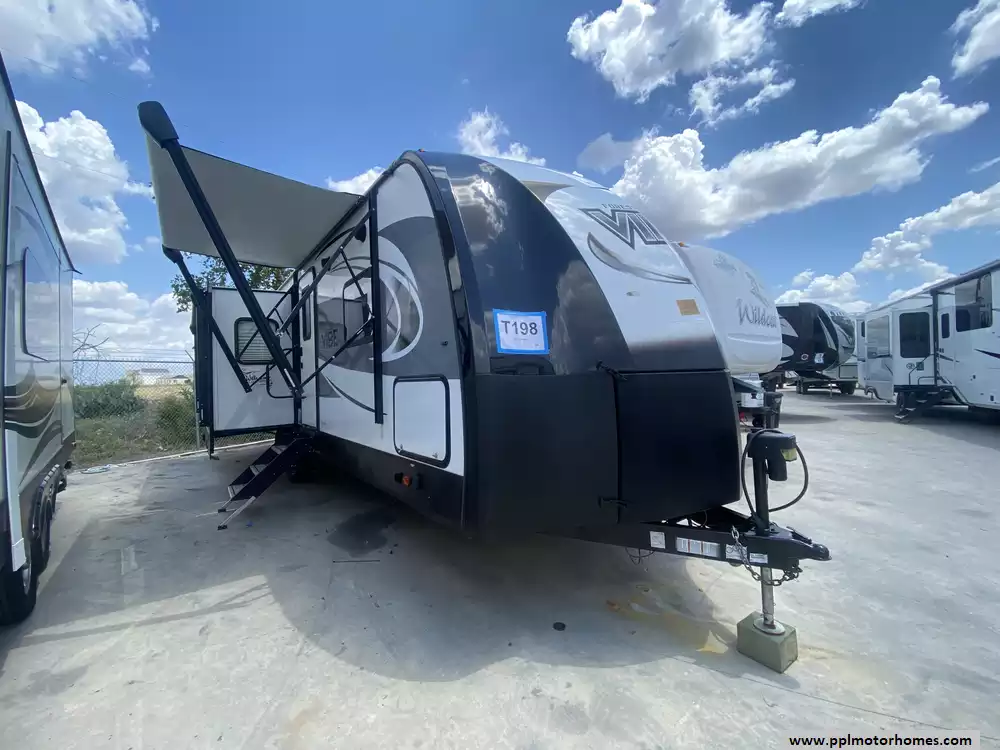 This 2019 Vibe 288RLS has an Electric Tongue Jack, 2 Slide-outs, 1 Non-Ducted And 1 Ducted Air Conditioner, Double Door 110v Residential Whirlpool Refrigerator, Automatic Main Awning, TV, DVD Player, Outside Shower, Microwave, 3 Burner Range, Oven