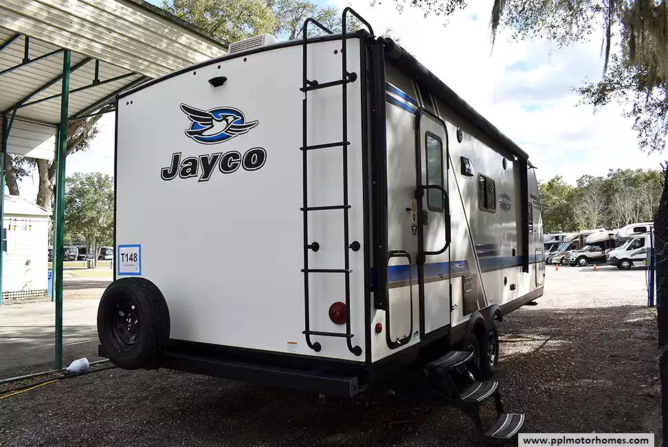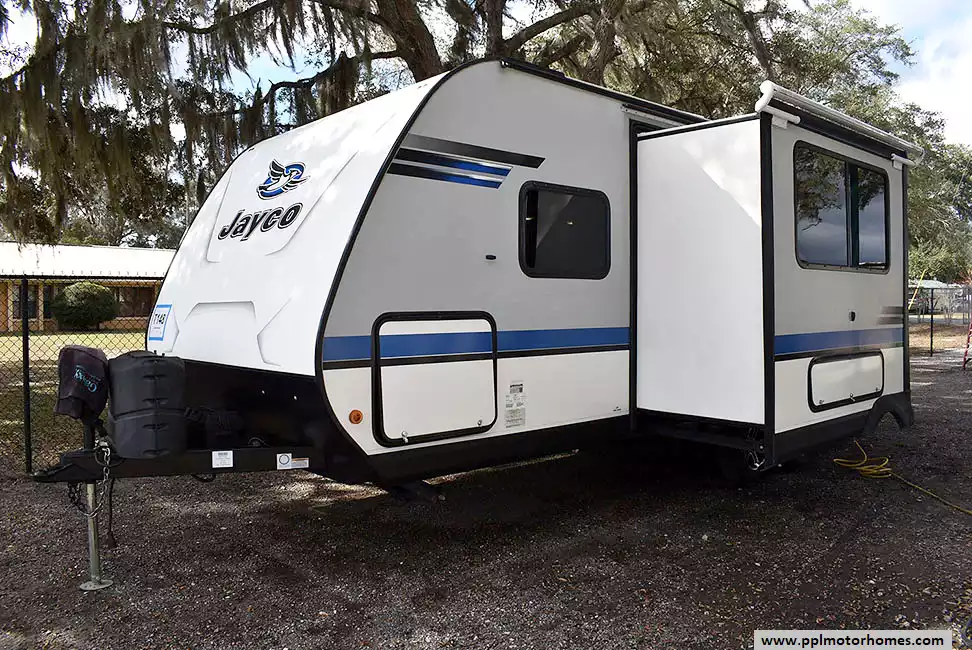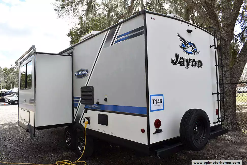 This 2019 Jayco Jay Feather 23RBM has an Electric Tongue Jack, 1 Slide-out, 1 Ducted Air Conditioner, Double Door Gas/12v Dometic Refrigerator, Automatic Main Awning, Solar Panel, Outside Speakers, TV, Outside Shower, Microwave, 3 Burner Range, Oven