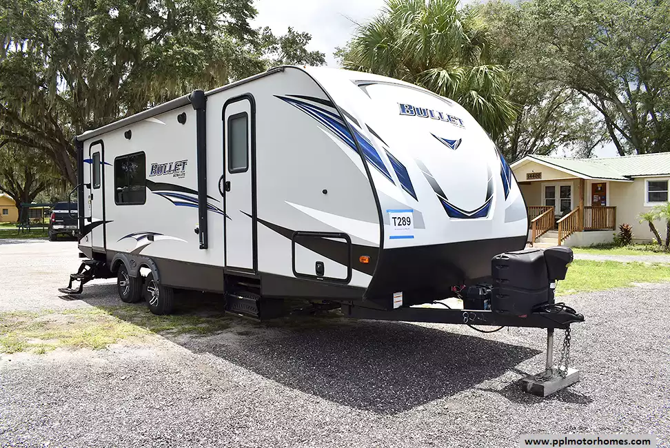 This 2019 Bullet Ultra Lite 248RKS has an Electric Tongue Jack, 1 Slide-out, 1 Ducted Air Conditioner, Double Door Gas/12v Dometic Refrigerator, Automatic Main Awning, Outside Stereo, TV, DVD Player, Outdoor Grill, Outside Shower, Microwave, 3 Burner Range
