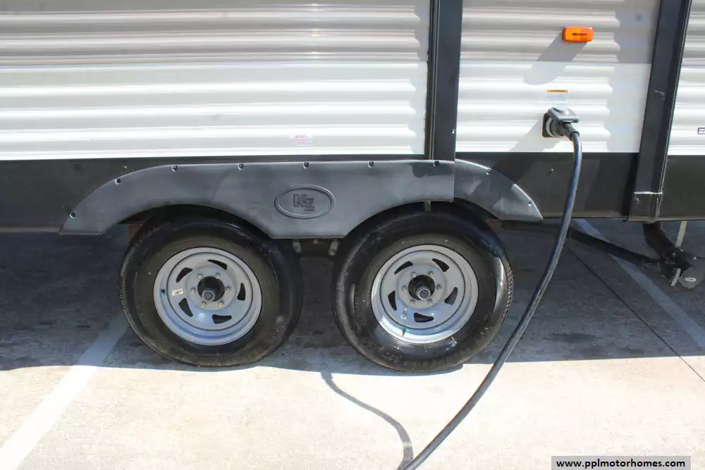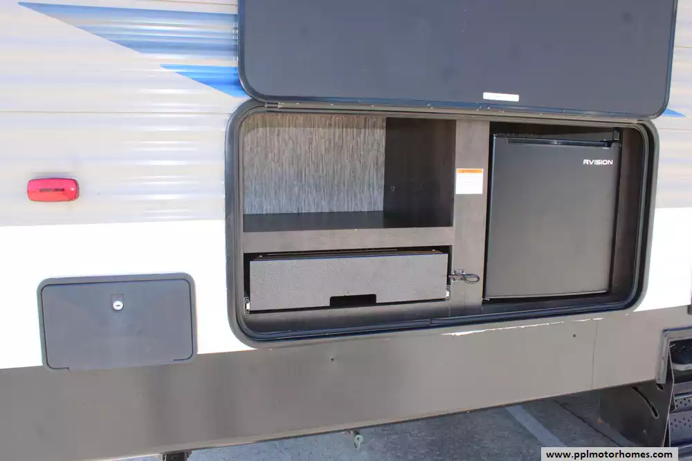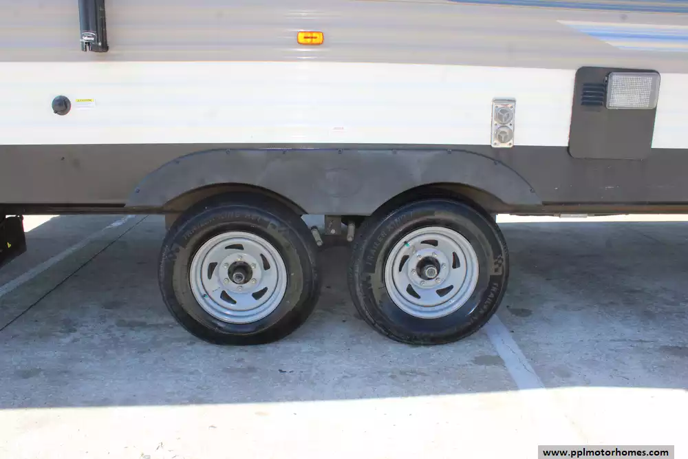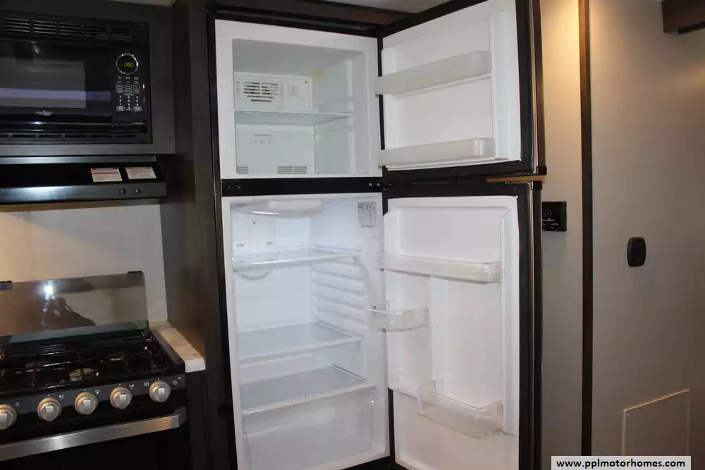 Specs: Length: 36.10 ft., Height: 10.8 ft., Width: 8 ft., Interior Height: 6.5 ft., Total Fresh Water Tank Capacity: 38 gal., Total Grey Tank Capacity: 32 gal., Total Black Water Tank Capacity: 32 gal., Propane Tank Capacity: 40 lbs.