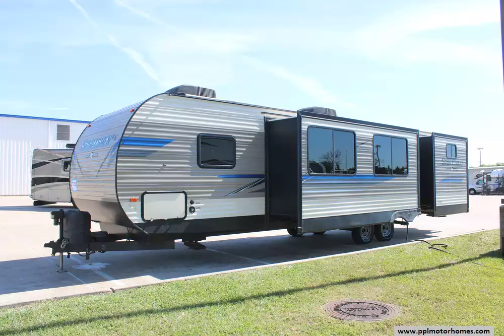 The 2019 Sportsmen LE 332BHKLE is a premier choice for families who refuse to compromise on space or comfort during their travels. This 36-foot travel trailer is renowned for its generous floor plan and two massive slide-outs that create an expansive, open-concept living area perfect for larger groups. Its reputation as a top-tier family coach is built on a thoughtful design that balances high-end amenities with practical durability. Whether you are hosting a cozy movie night by the electric fireplace or preparing a full meal in the well-appointed kitchen, the Sportsmen LE delivers a refined experience that truly feels like a home away from home.
