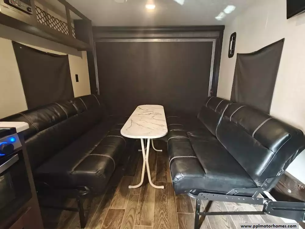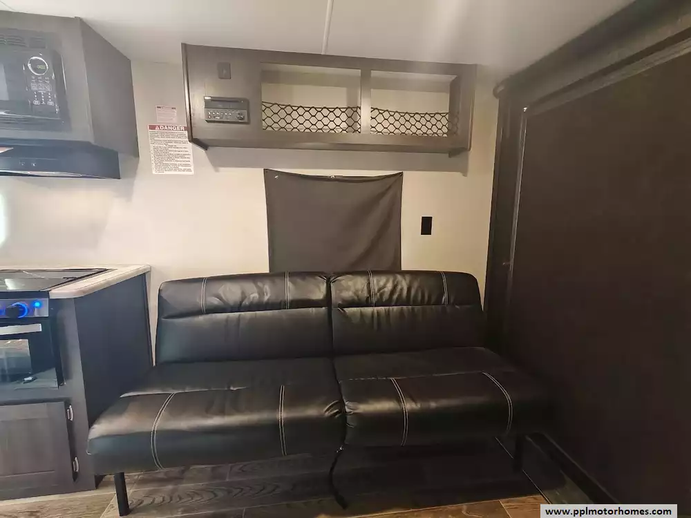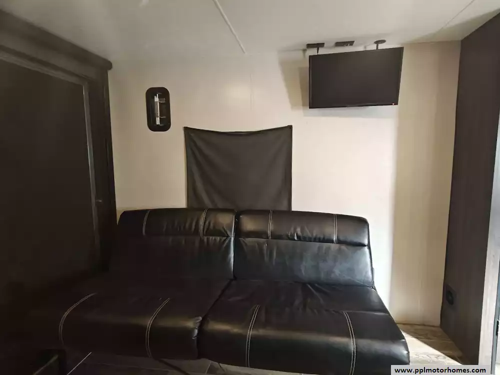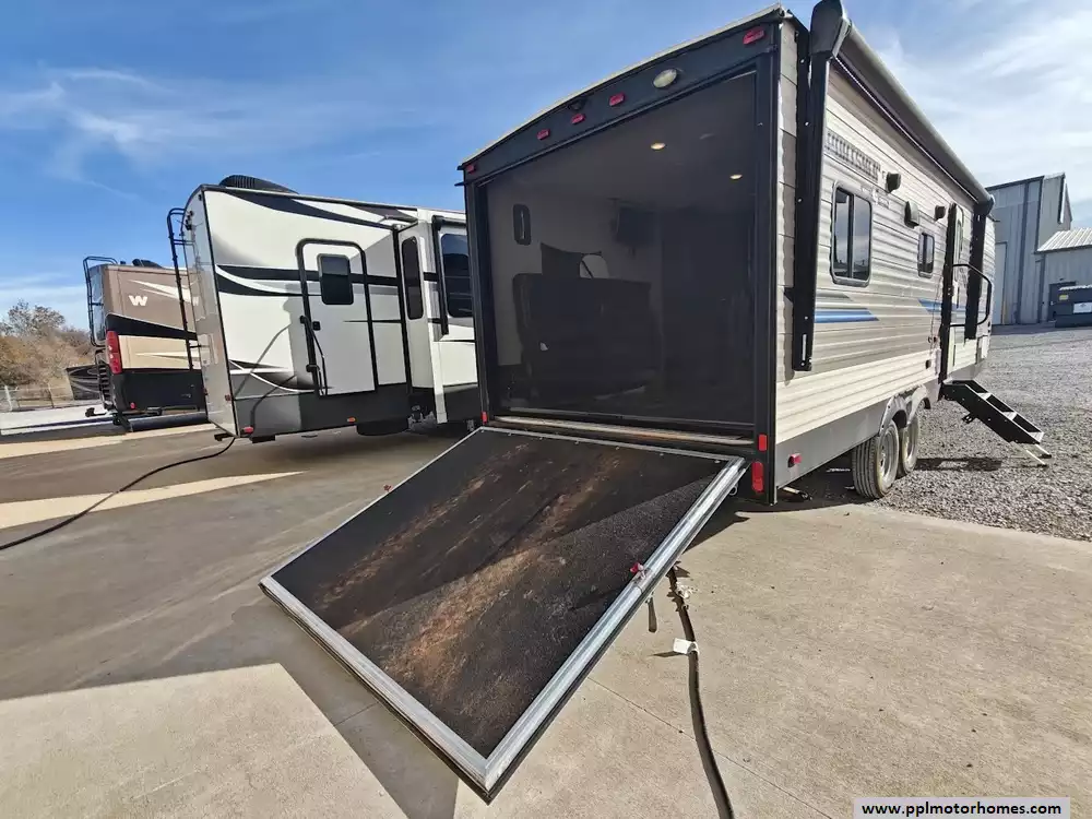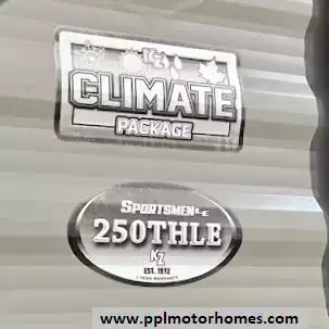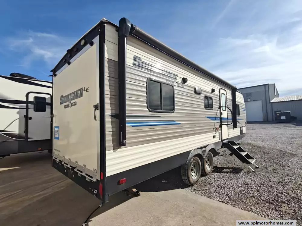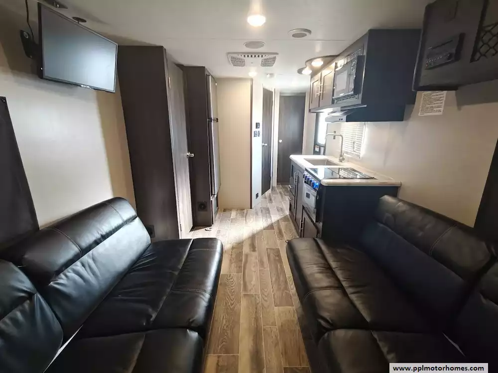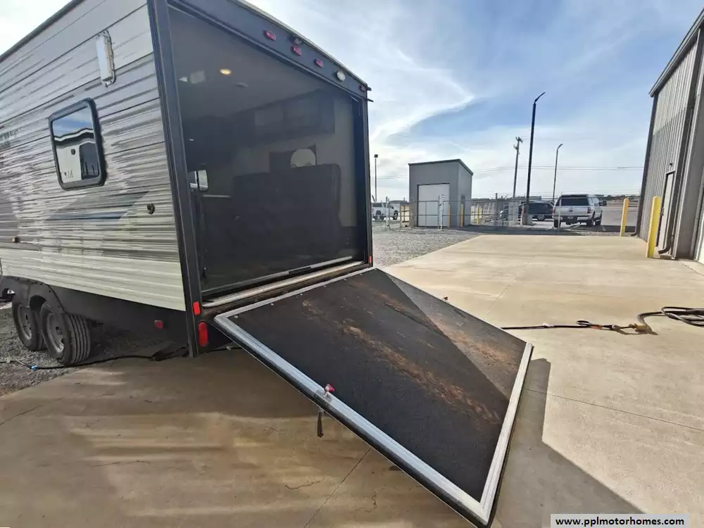 The 2019 KZ Sportsmen LE 250THLE features a versatile toy hauler floorplan with a dedicated rear garage area that converts into a living/sleeping space, and a private front bedroom. The front bedroom has a full walk-around queen bed is located in the front of the trailer. This area is private and includes wardrobes on either side of the bed. The Kitchen features a well-equipped, residential-style kitchen with seamless countertops, a 2 door Everchill refridgerator, 3-burner stove ,microwave and a large stainless steel sink. It is designed to provide a home-like cooking experience while on the road. The kitchen area offers large overhead cabinets and a pnatry for all essential items. The bathroom has a full shower with a radius glass door, storage caninets and a power exhaust fan. There is a dedicated rear garage area for transporting recreational vehicles or equipment. The approximate cargo area is around 7.92 feet (95 inches) with a hidgt of approximately 6.83 feet (82 inches). A large rear ramp door provides easy access for loading and unloading toys. The garage floor includes integrated tie-downs to secure your equipment safely during transit. When the cargo is unloaded, the space converts into a living area with two 70-inch rollover sofas and a freestanding table for dining or relaxing, which can then be folded away for transport.