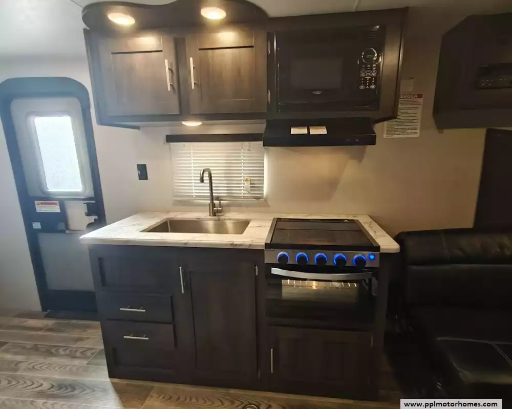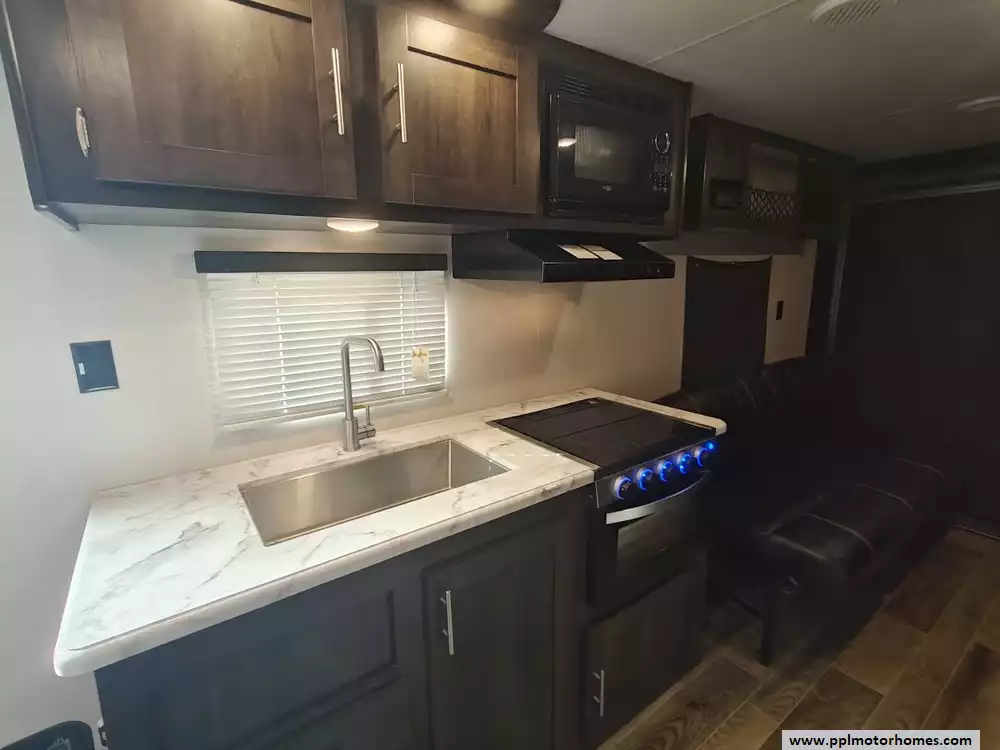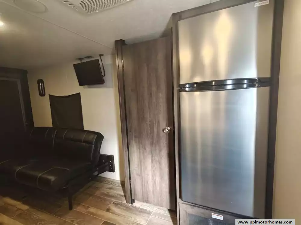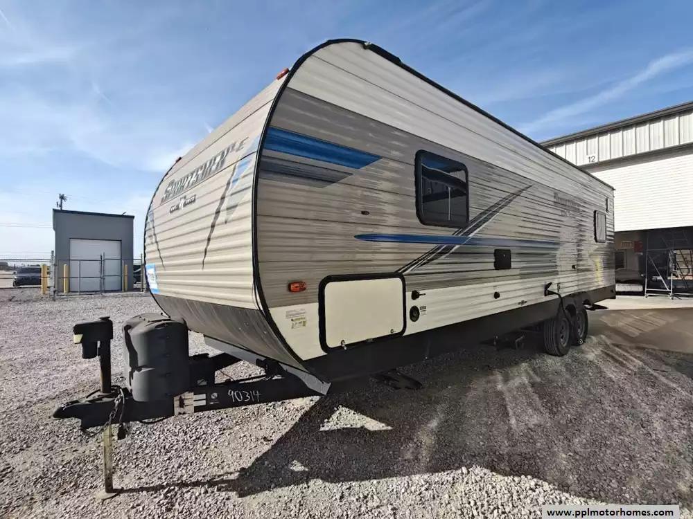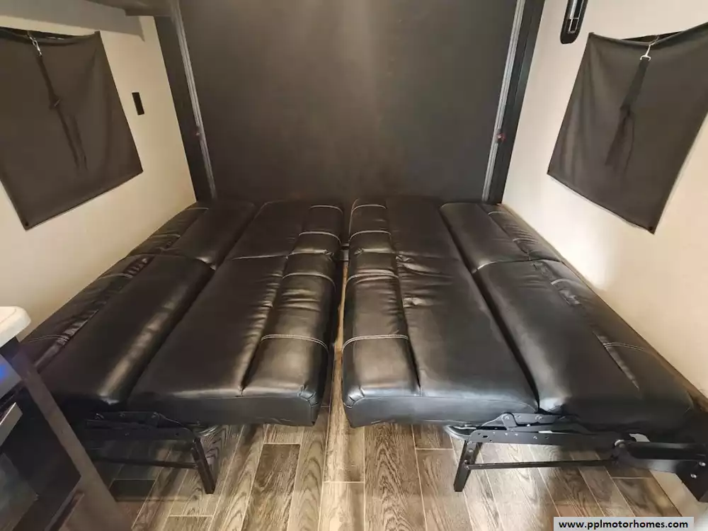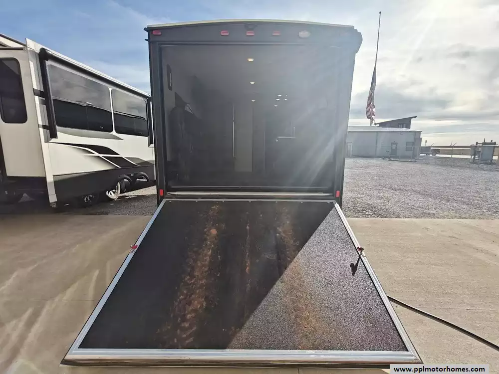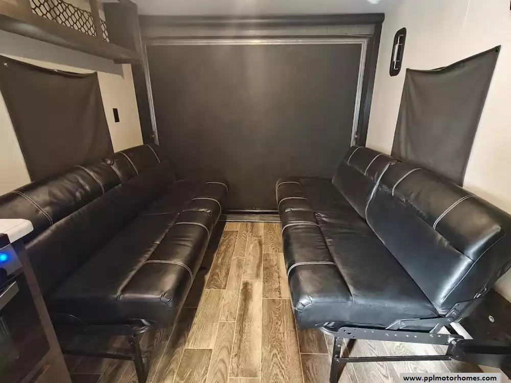 The 2019 KZ Sportsmen LE 250THLE features a versatile toy hauler floorplan with a dedicated rear garage area that converts into a living/sleeping space, and a private front bedroom. The front bedroom has a full walk-around queen bed is located in the front of the trailer. This area is private and includes wardrobes on either side of the bed. The Kitchen features a well-equipped, residential-style kitchen with seamless countertops, a 2 door Everchill refridgerator, 3-burner stove ,microwave and a large stainless steel sink. It is designed to provide a home-like cooking experience while on the road. The kitchen area offers large overhead cabinets and a pnatry for all essential items. The bathroom has a full shower with a radius glass door, storage caninets and a power exhaust fan. There is a dedicated rear garage area for transporting recreational vehicles or equipment. The approximate cargo area is around 7.92 feet (95 inches) with a hidgt of approximately 6.83 feet (82 inches). A large rear ramp door provides easy access for loading and unloading toys. The garage floor includes integrated tie-downs to secure your equipment safely during transit. When the cargo is unloaded, the space converts into a living area with two 70-inch rollover sofas and a freestanding table for dining or relaxing, which can then be folded away for transport.