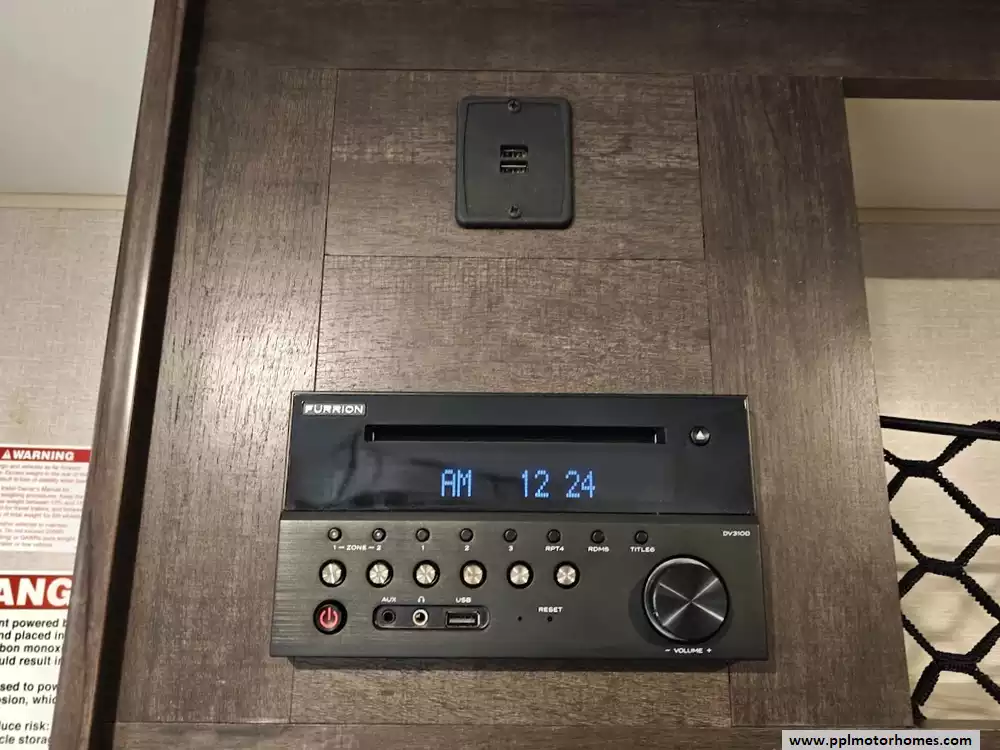 Outside you will find a large power awning, flip up entry steps, outside shower, and speakers. This toy hauler has the optional Climate Package which adds a heated, insulated, and fully enclosed underbelly making the RV more capable in colder temperatures.