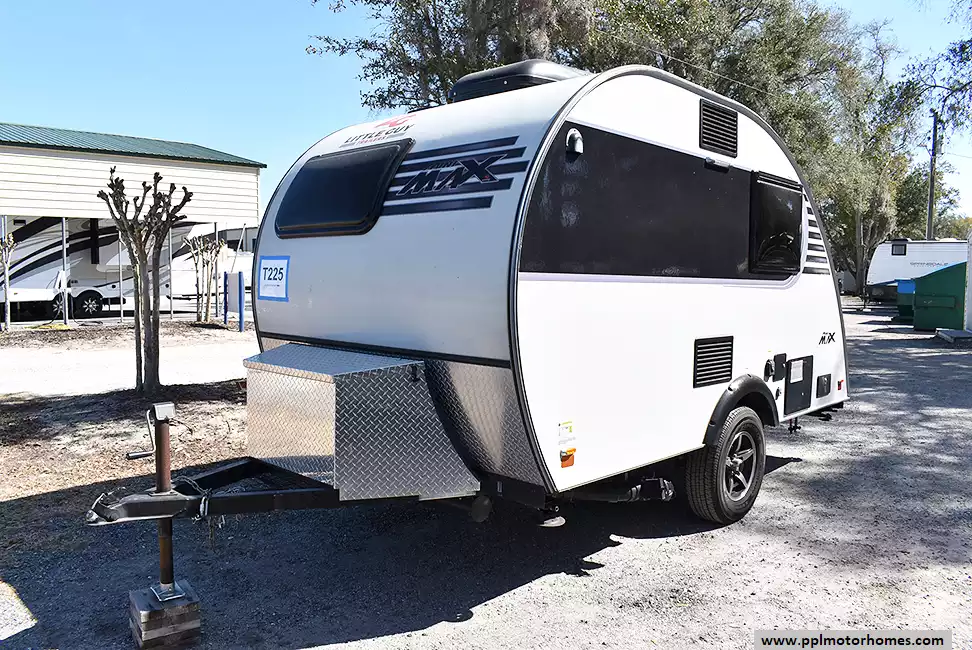 This 2019 Little Guy Mini MAX has a 1 Non-Ducted Air Conditioner, Double Door Gas/110v/12v Norcold Refrigerator, Main Awning, Solar Panel, Outside Speakers, TV, Outside Shower, Microwave, 2 Burner Range