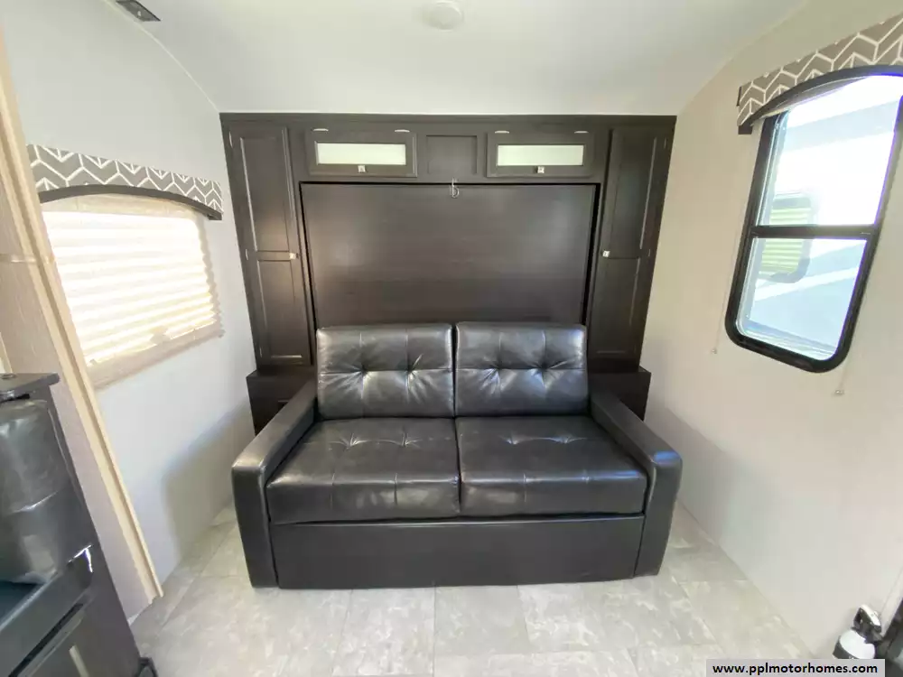 This 2019 Sonic 220VBH has an Electric Tongue Jack, 1 Slide-out, 1 Non-Ducted Air Conditioner, Double Door Gas/110v Norcold Refrigerator, Automatic Main Awning, Satellite Dish, Outside Speakers, TV, DVD Player, Outside Shower, Convection Microwave, 2 Burner Range, Gas Fireplace, Convertible Seat Between Dinette and Sleeper Sofa, Full Size Bedroom Closet