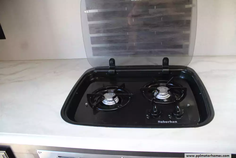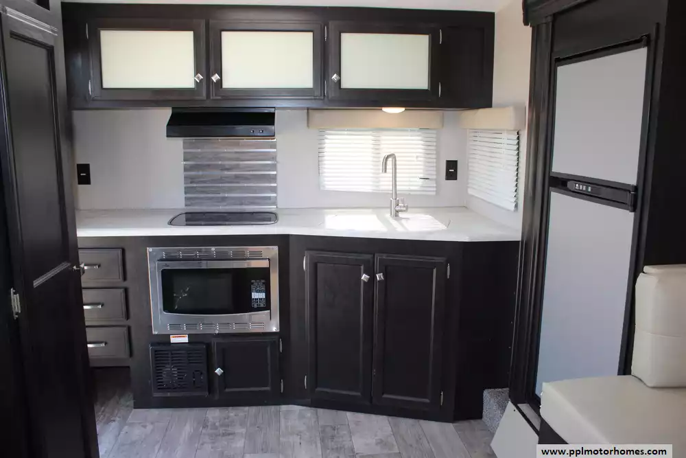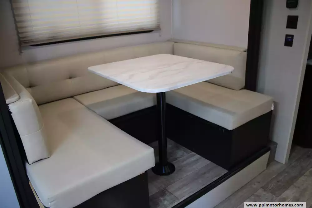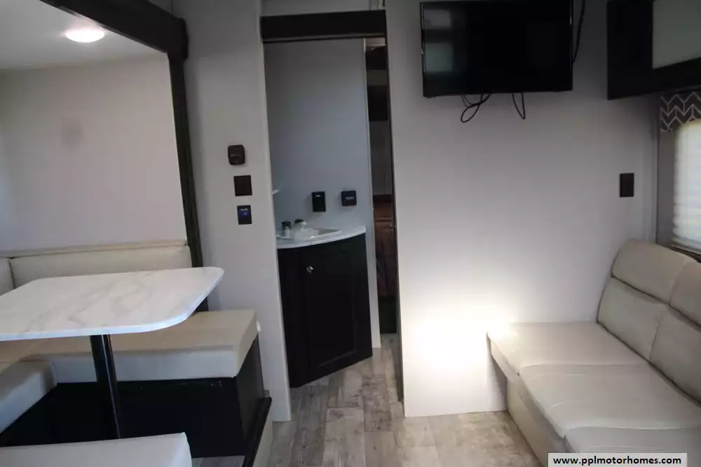 The 2019 Venture RV Sonic 231VRK is a compact yet well-appointed travel trailer measuring approximately 26 ft 9 in in length and 7 ft 6 in in width, offering a comfortable interior headroom of 82 in. Built on a lightweight NXG frame with a one-piece fiberglass roof, this tandem-axle trailer ensures durability without adding unnecessary weight. Its rear kitchen layout, centered around a mid-size refrigerator, two-burner range, and U-shaped dinette in the slide-out, creates a functional living area alongside a cozy 64-in "Jiffy Sofa". Sleeping arrangements accommodate up to six, including a front queen bedroom and convertible seating surfaces. Utilities include a 38-gal fresh-water tank, 60-gal gray and 30-gal black tanks, a 6-gal electric/gas water heater, 20,000-BTU furnace, and a 17-ft awning for added outdoor comfort. Additional conveniences include a brand-new roof, pass-through storage, solar and backup-camera pre-wiring, and durable decor choices like latte or granite finishes.