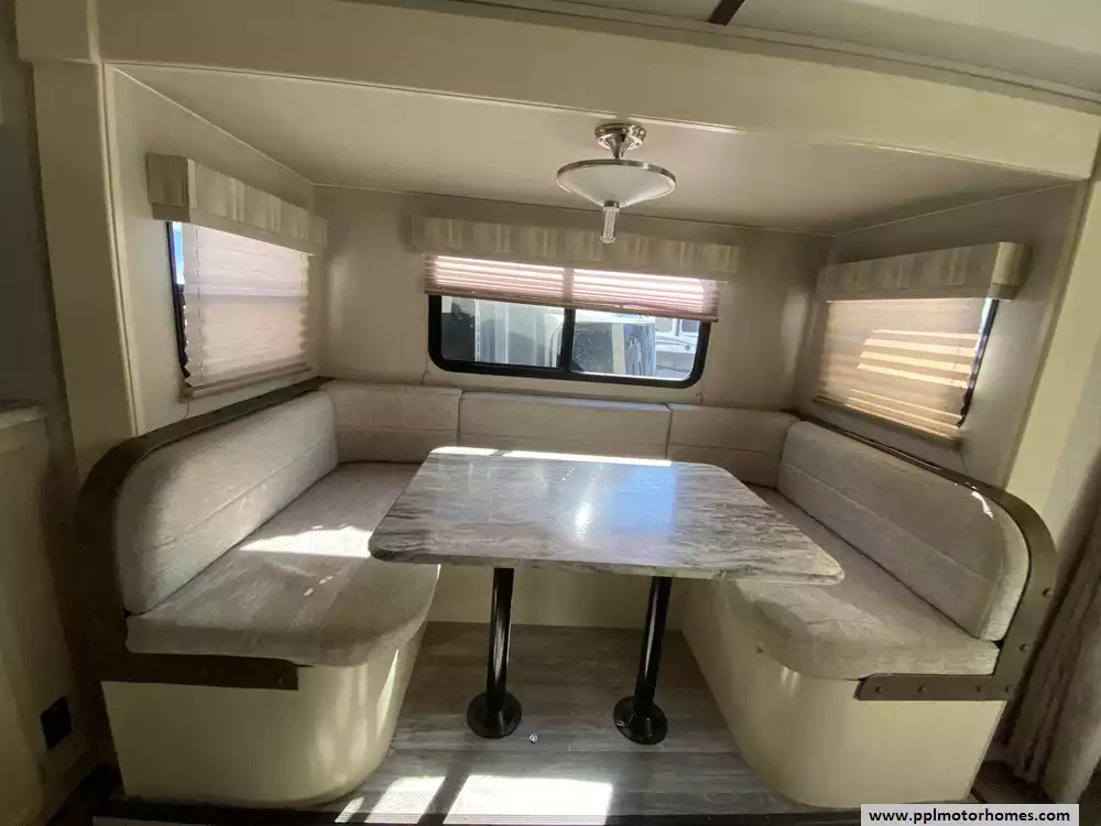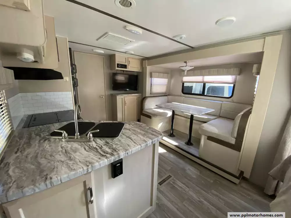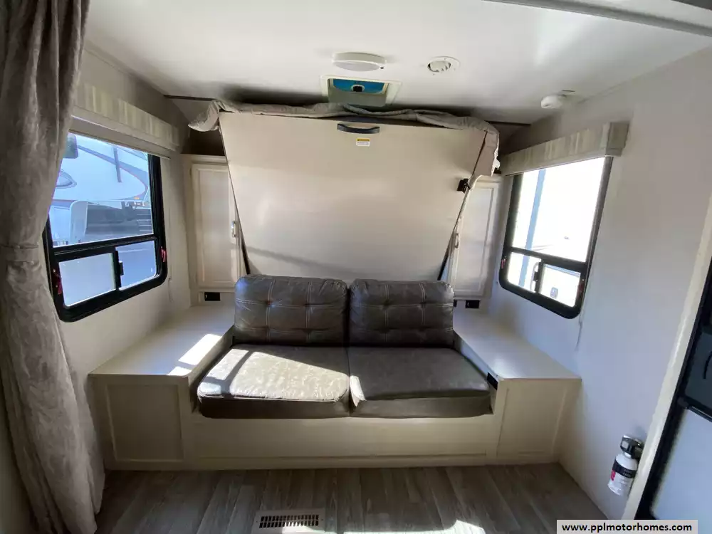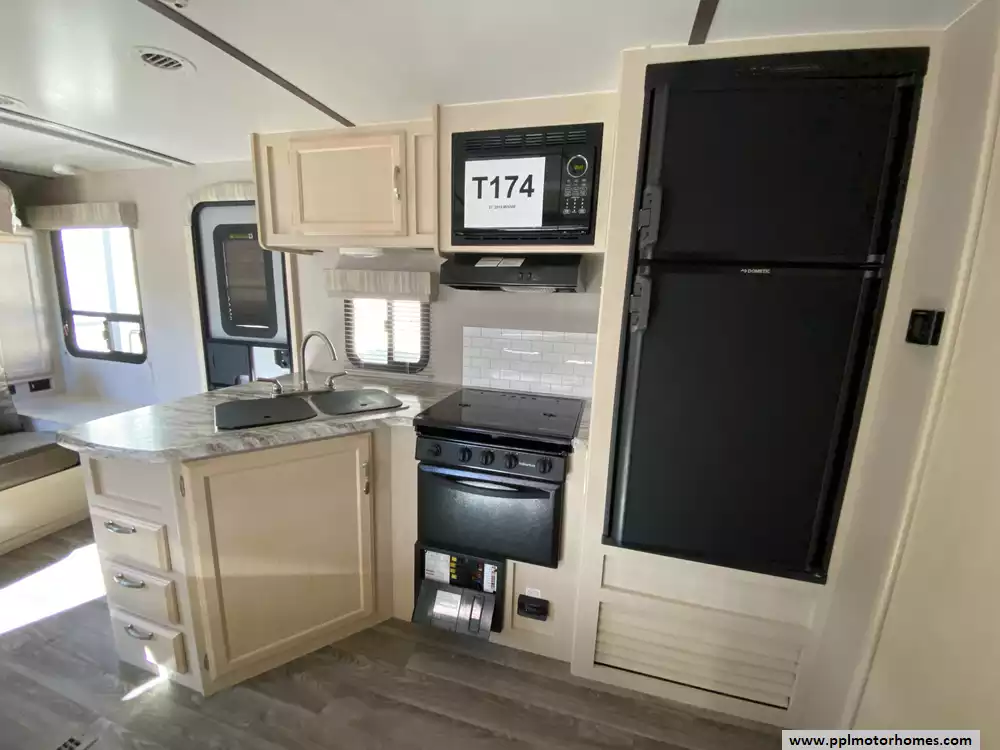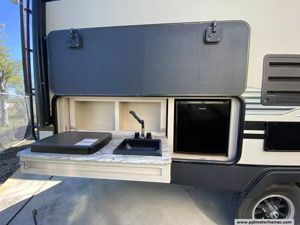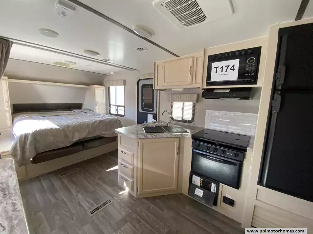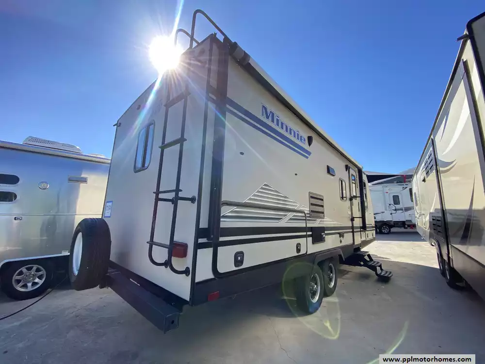 This 2019 Minnie 2201MB has an Electric Tongue Jack, 1 Slide-out, 1 Ducted Air Conditioner, Double Door Gas/110v Dometic Refrigerator (Additional Refrigerator Present), Automatic Main Awning, Outside Speakers, TV, DVD Player, Outdoor Kitchen, Outside Shower, Microwave, 3 Burner Range, Oven