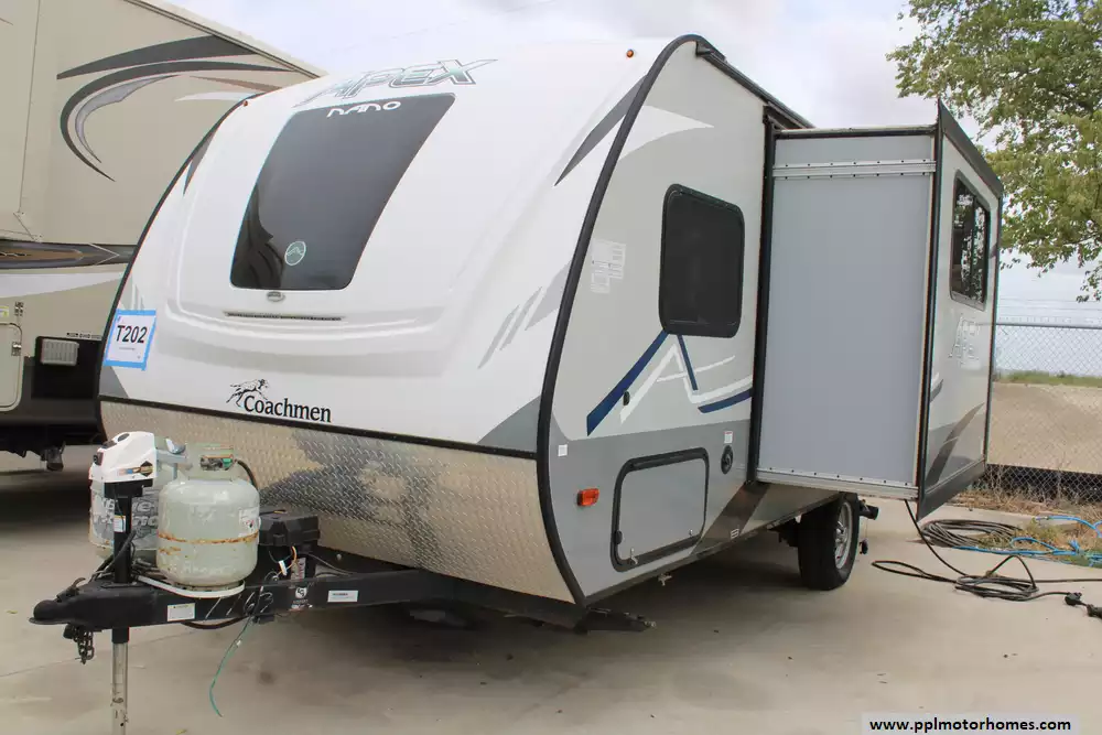 This 2020 Apex Nano 19BH has an Electric Tongue Jack, 1 Slide-out, 1 Non-Ducted Air Conditioner, Double Door Gas/110v Dometic Refrigerator, Automatic Main Awning, Outside Speakers, TV, Outside Shower, Microwave, 2 Burner Range