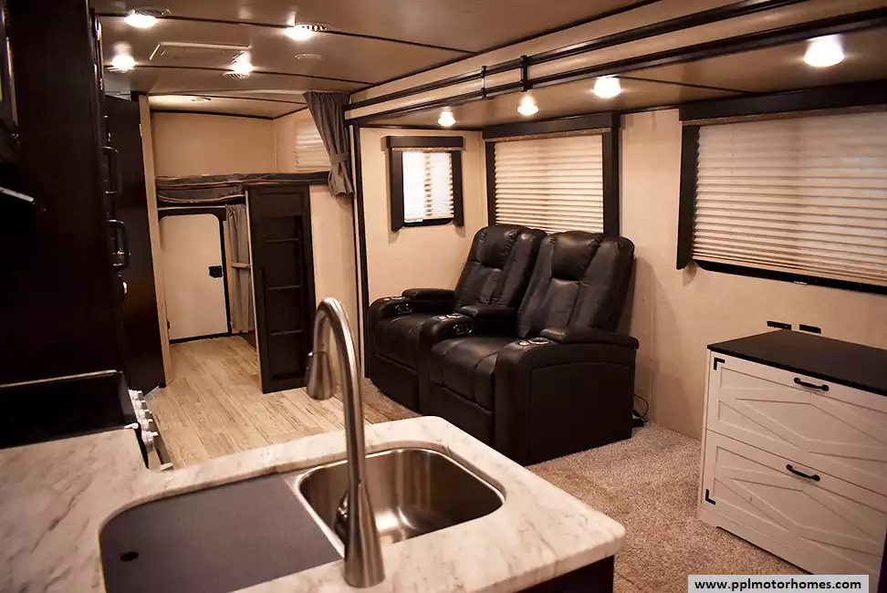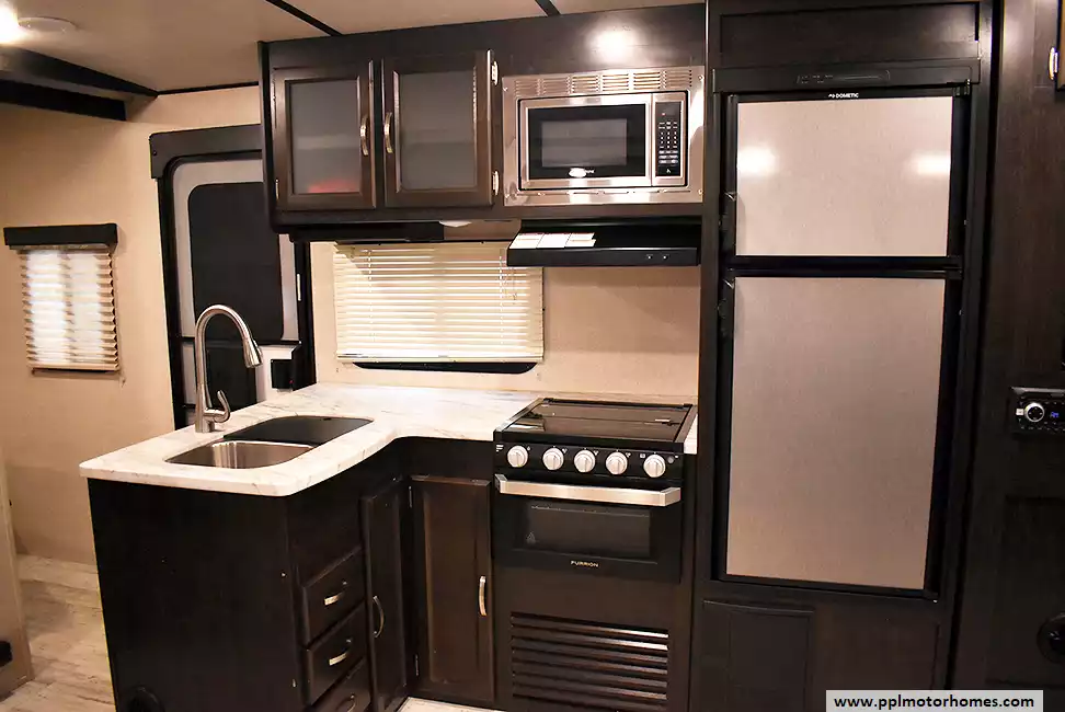 This 2020 Spirit Ultra Lite 2963BH has an Electric Tongue Jack, 1 Slide-out, 1 Non-Ducted And 1 Ducted Air Conditioner, Double Door Gas/110v Dometic Refrigerator (Additional Refrigerator Present), Automatic Main Awning, Satellite Receiver, Outside Speakers, TV, Outdoor Grill, Outdoor Kitchen, Outside Shower, Microwave, 3 Burner Range