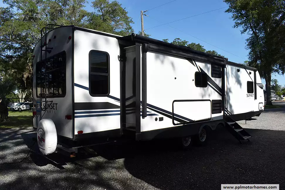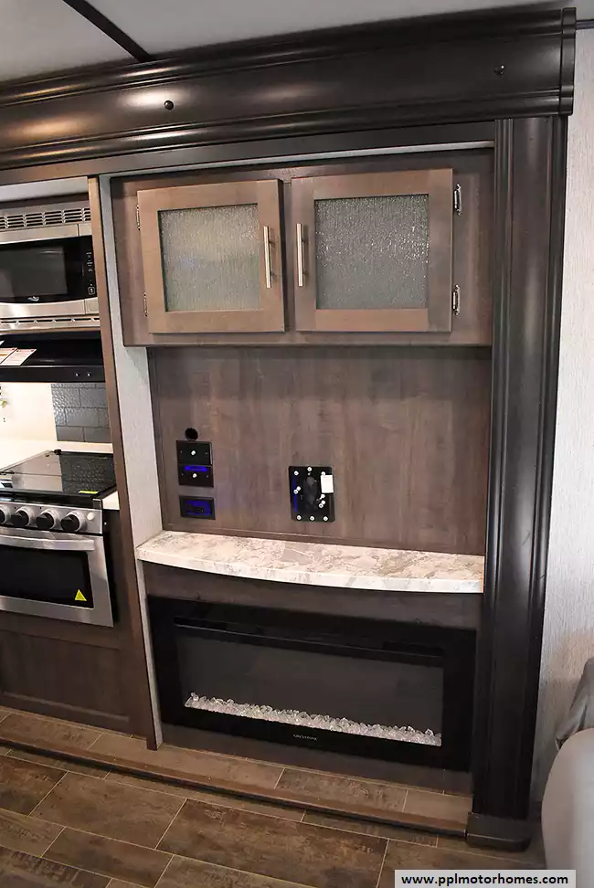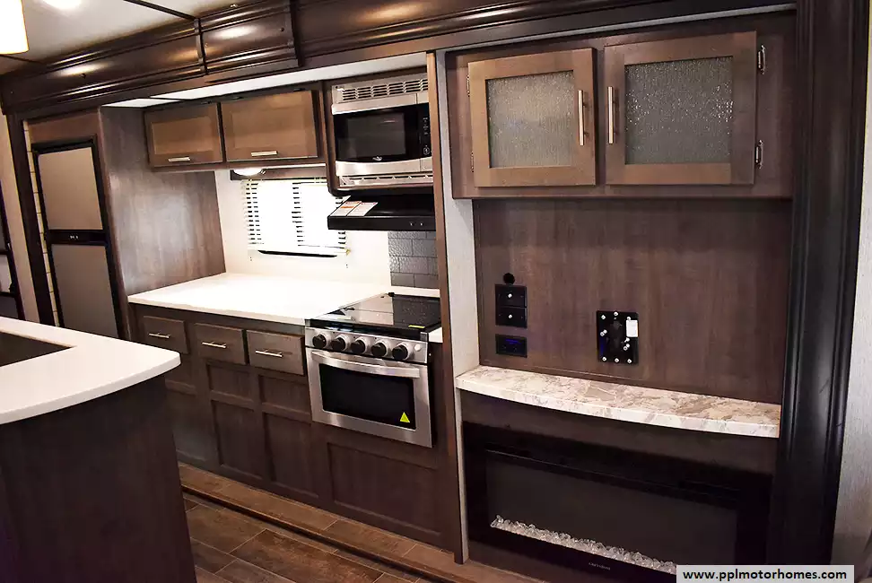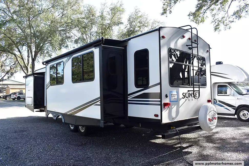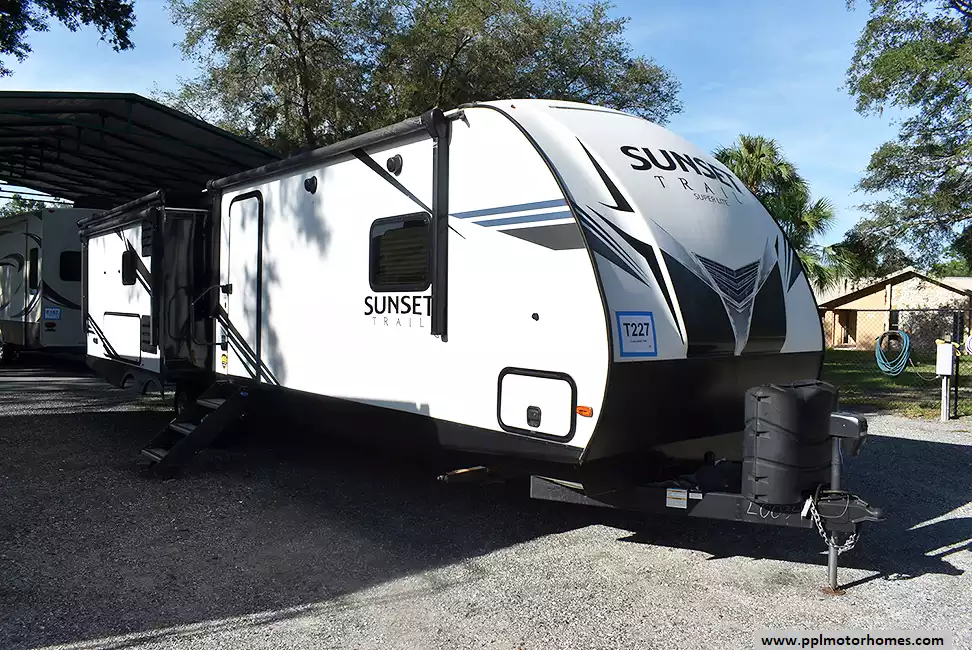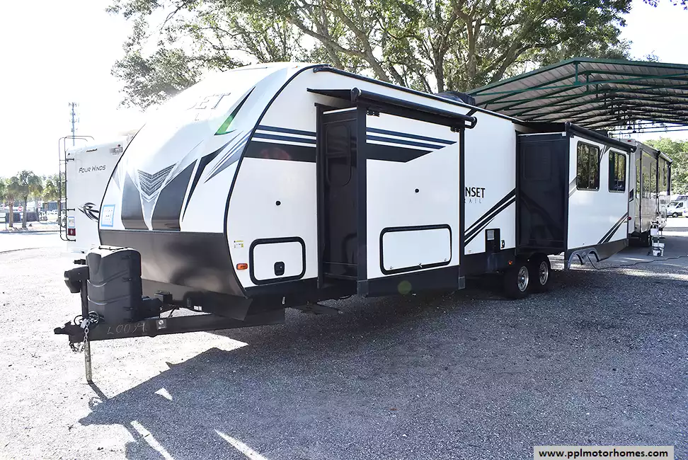 This 2020 Sunset Trail 330SI has an Electric Tongue Jack, 1 Slide-out, 1 Ducted Air Conditioner, Double Door Gas/110v Norcold Refrigerator (Additional Refrigerator Present), Automatic Main Awning And Window/Slide Awnings, Outside Speakers, Outdoor Kitchen, Fireplace, Microwave, 3 Burner Range, Oven
