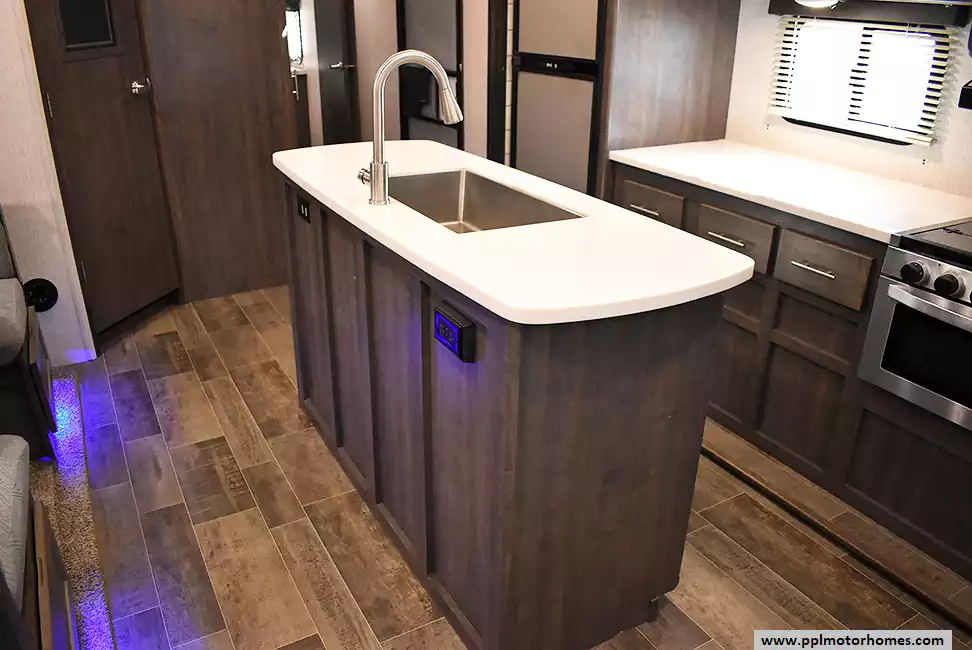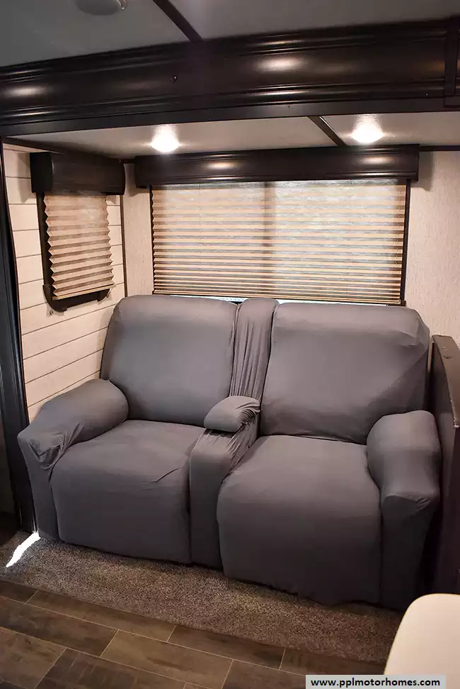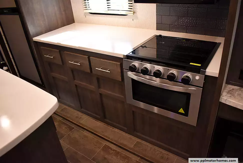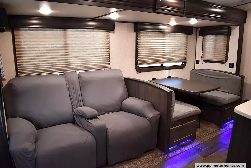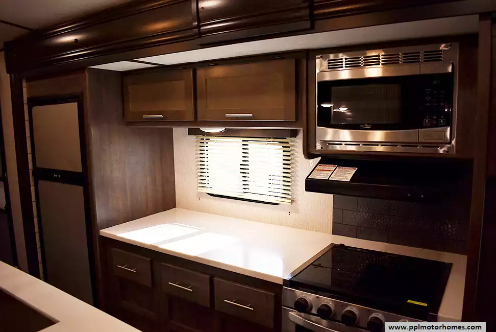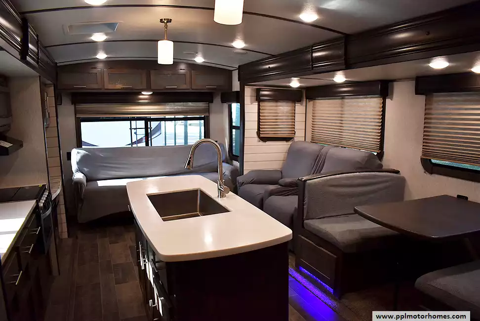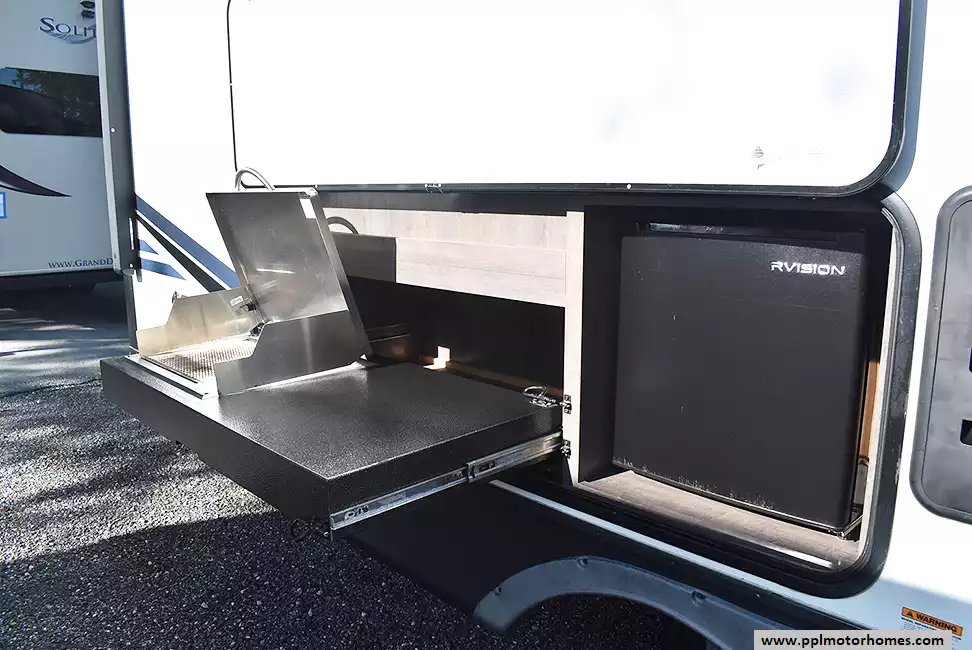 This 2020 Sunset Trail 330SI has an Electric Tongue Jack, 1 Slide-out, 1 Ducted Air Conditioner, Double Door Gas/110v Norcold Refrigerator (Additional Refrigerator Present), Automatic Main Awning And Window/Slide Awnings, Outside Speakers, Outdoor Kitchen, Fireplace, Microwave, 3 Burner Range, Oven