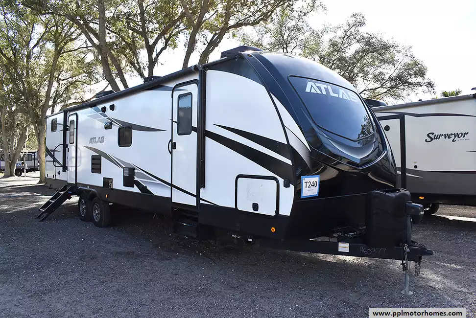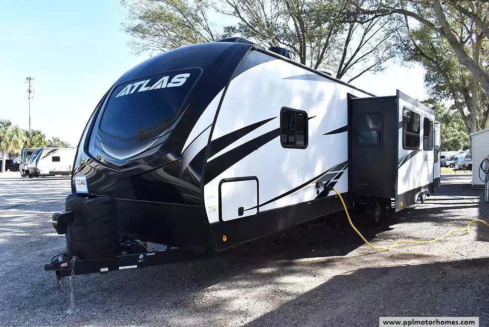 This 2020 Atlas 3302BH has an Electric Tongue Jack, 2 Slide-outs, 2 Ducted Air Conditioners, Double Door Gas/12v Dometic Refrigerator (Additional Refrigerator Present), Automatic Main Awning, Solar Panel, Outside Speakers, TV, Outdoor Grill, Outdoor Kitchen, Outside Shower, Fireplace, Microwave, 3 Burner Range, Oven