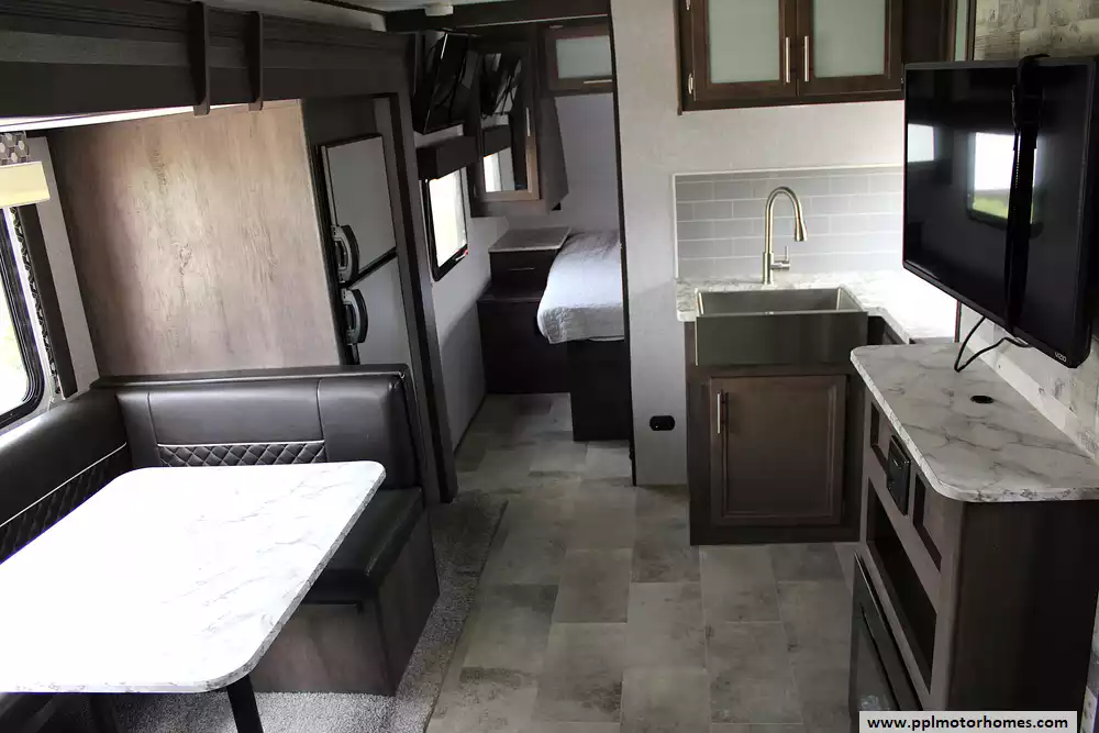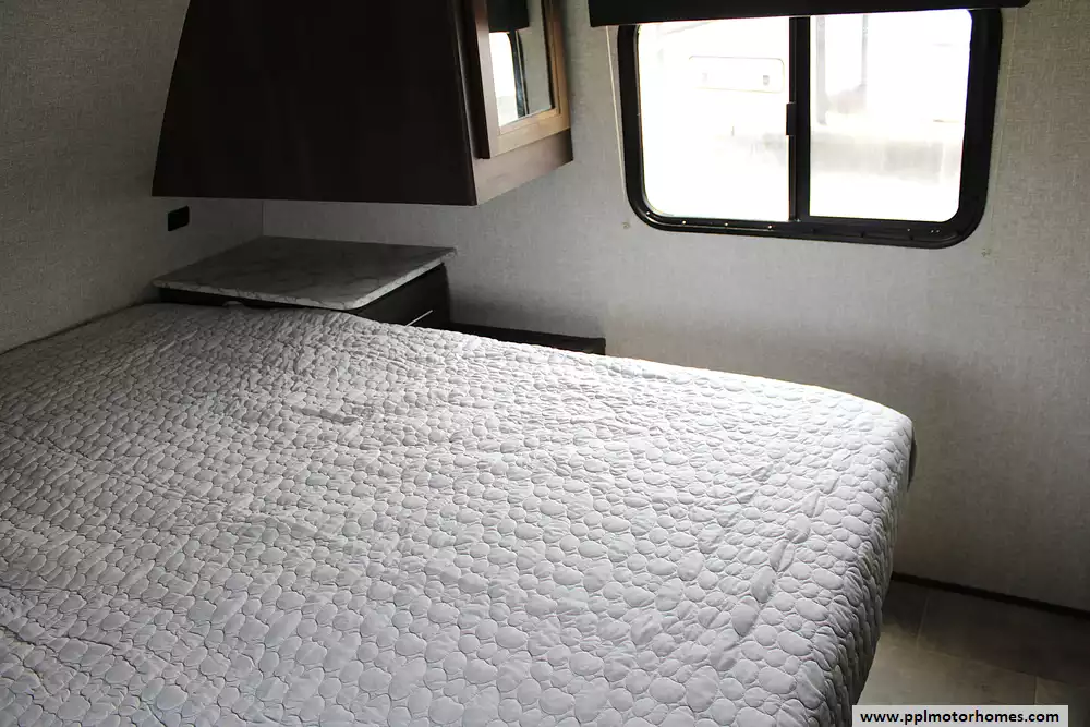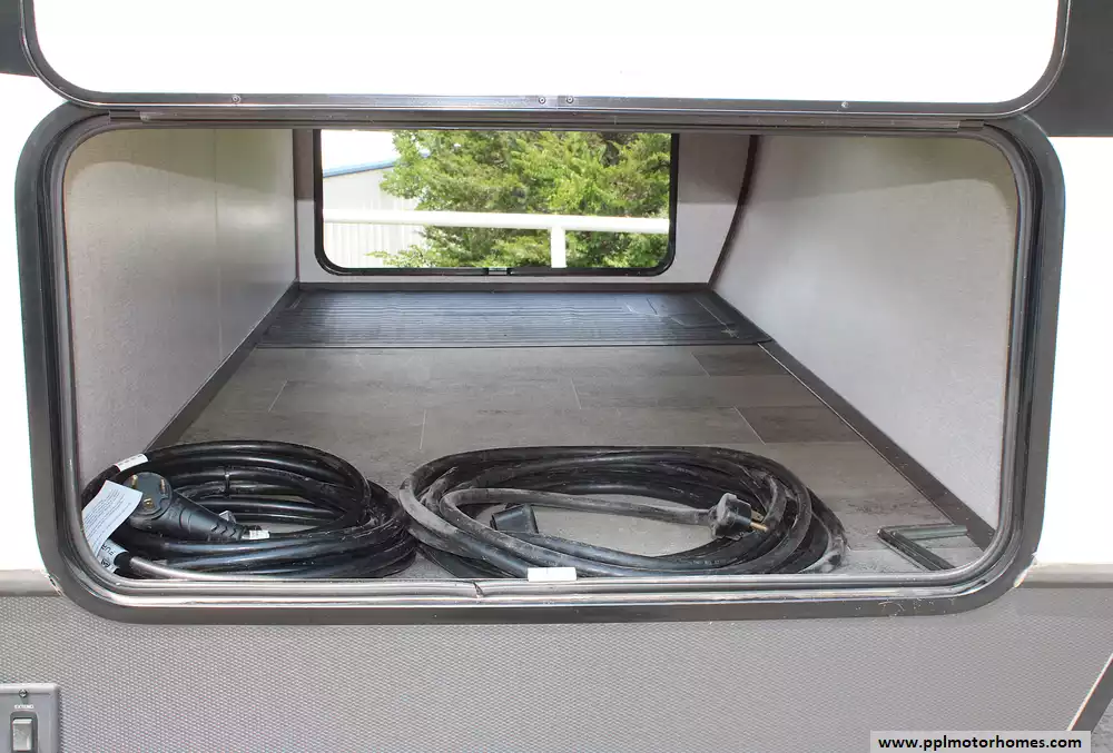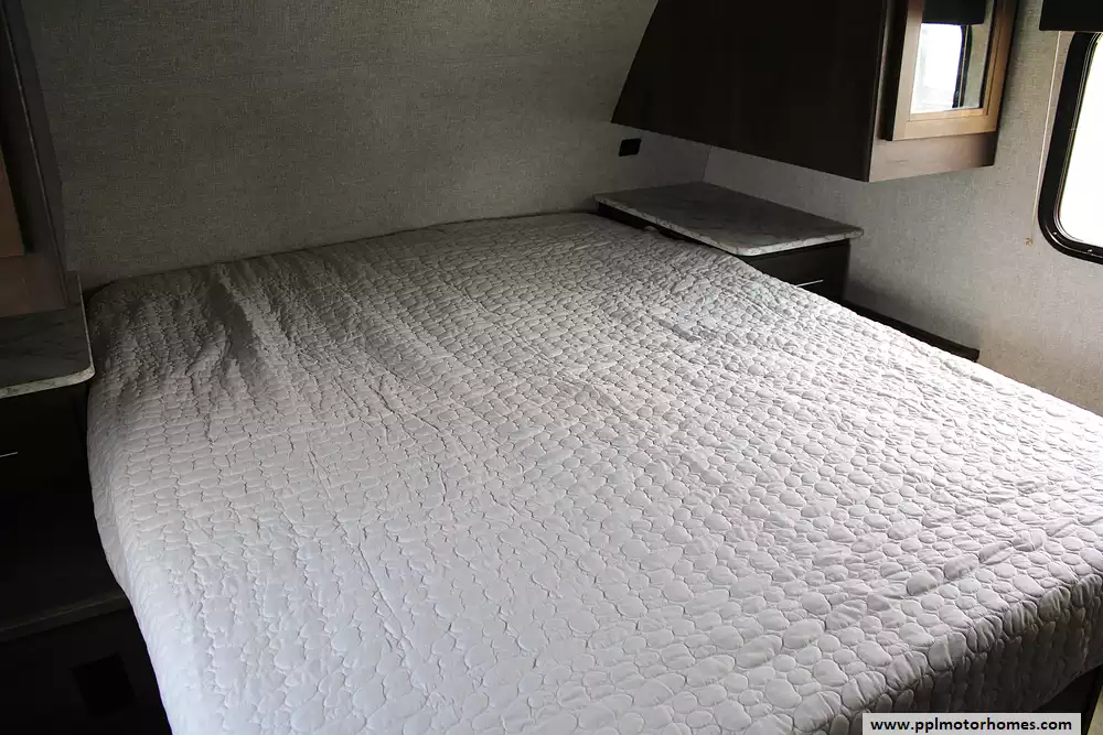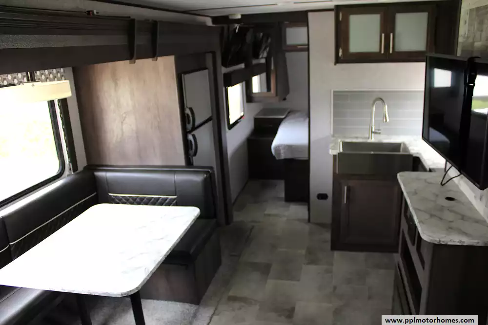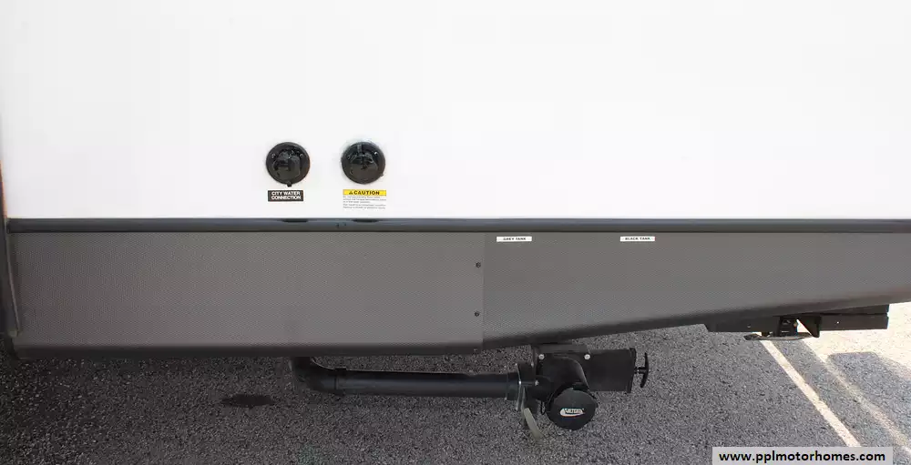 Built for ease of towing and setup, this unit has a dry weight of just 5,700 lbs, making it towable by most half-ton trucks and properly equipped SUVs. It's equipped with electric stabilizer jacks, a power tongue jack, and new tires for smooth, hassle-free travel. The fully enclosed underbelly, aluminum frame construction, and fiberglass exterior offer durability and extended-season camping capabilities.