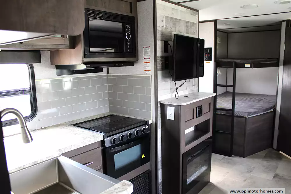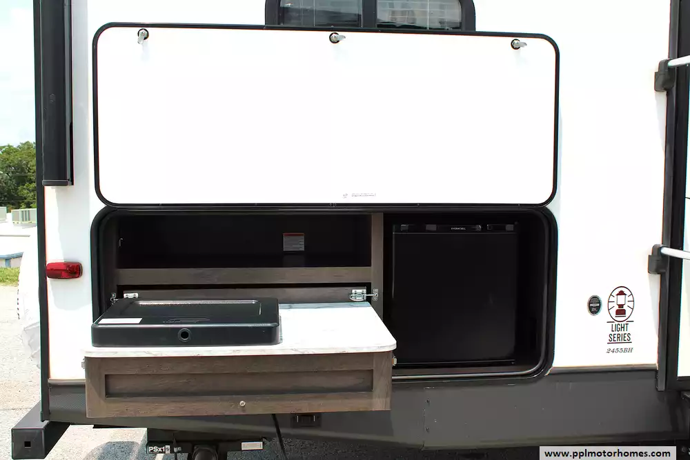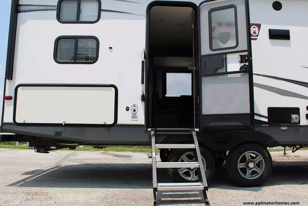 Loaded with sought-after upgrades, it includes 2 Smart TVs, ducted A/C, solar prep, a backup camera, and an outdoor kitchen with a mini fridge and cooktop. You'll also enjoy an 18' power awning with LED lighting, exterior speakers, pass-through storage, and USB charging ports throughout the cabin. The spacious full bathroom includes a tub/shower combo, and the kitchen is equipped with a 3-burner range, oven, microwave, and pantry storage. This Coleman Light 2455BH is the total package--comfortable, towable, and ready to create lasting memories on the road