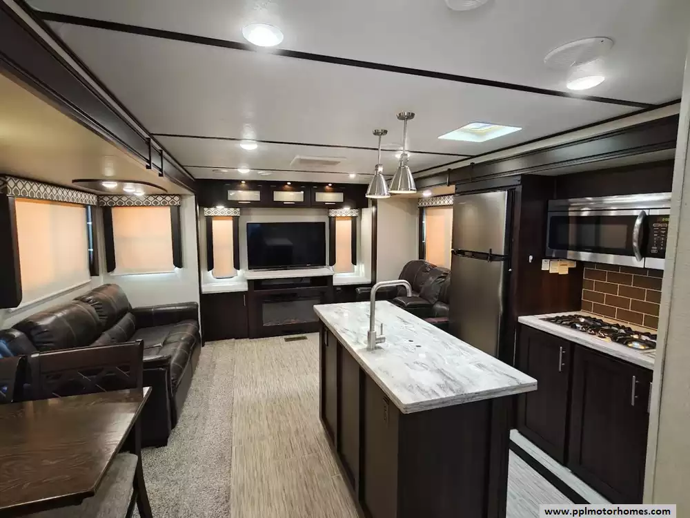 The living area features a large 50" LED TV, a fireplace for cozy evenings, theater seating and a hide-a-bed sofa.