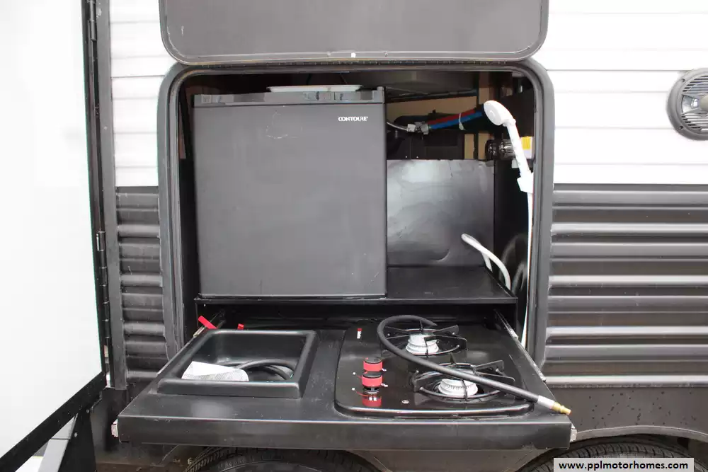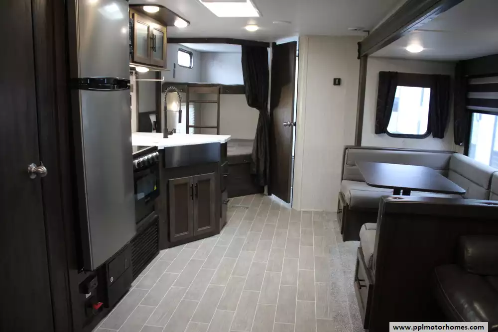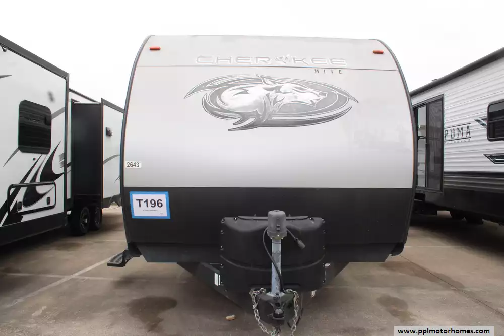 The 2020 Forest River Cherokee 264DBH is a family-friendly travel trailer built for comfortable and versatile camping, featuring a 33-foot overall length with one slide-out and a double bunkhouse floorplan that can sleep up to 10 people, making it ideal for larger groups or families. Inside you'll find a central living area with a U-shaped dinette, a well-equipped kitchen with a three-burner cooktop, refrigerator, and ample storage, plus a private front bedroom with a queen bed, a full bathroom, and plenty of seating and sleeping options thanks to the rear double bunks and convertible dinette. Exterior conveniences often include a 15' power awning, outdoor kitchen prep, power tongue jack, and abundant exterior storage, while standard amenities like air conditioning, ample holding tanks, and modern interior finishes help make extended stays at the campsite comfortable and enjoyable. This Cherokee features the "Basecamp Package" and "Campfire Package".