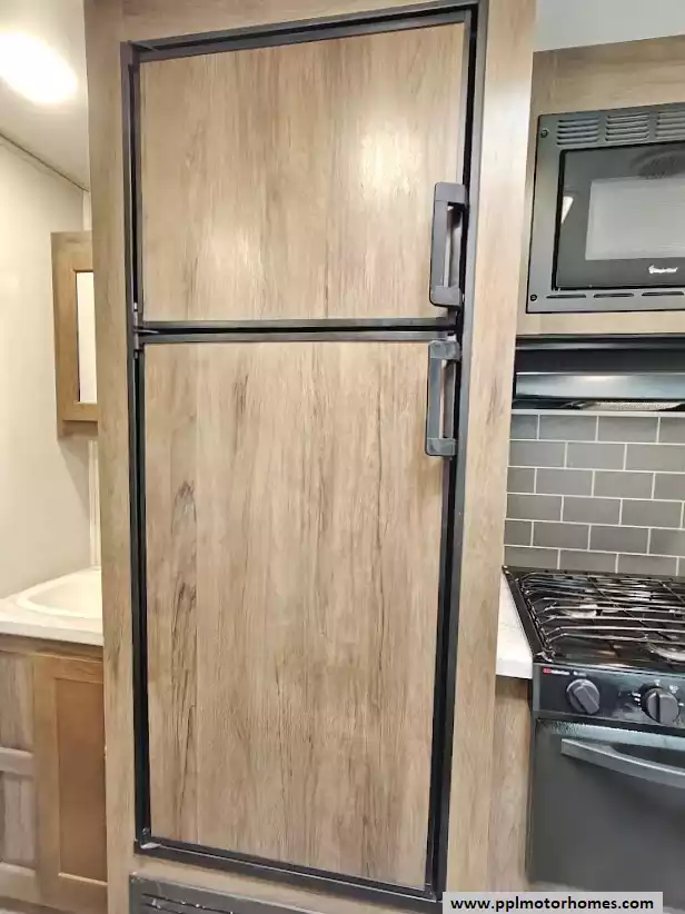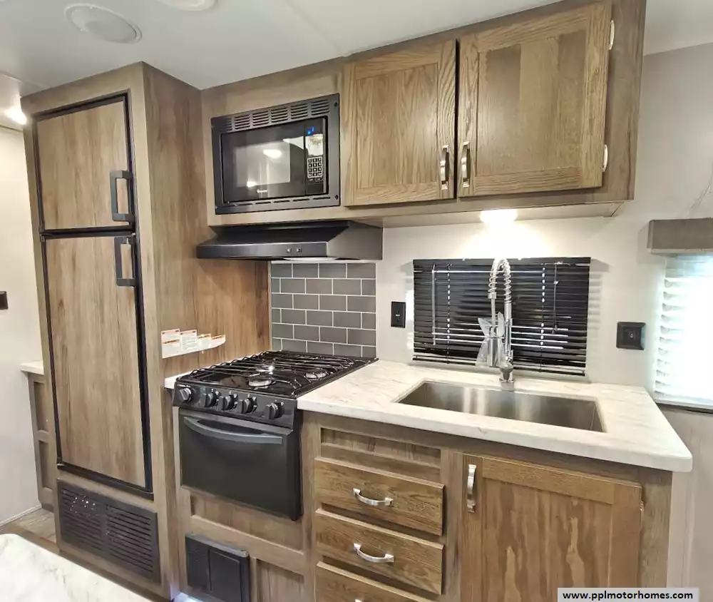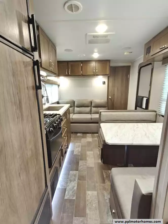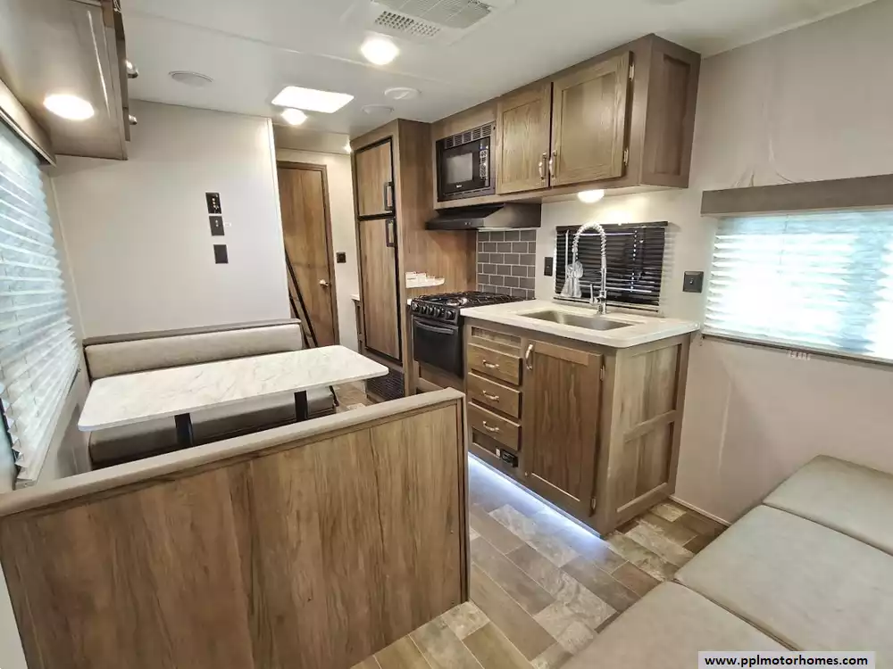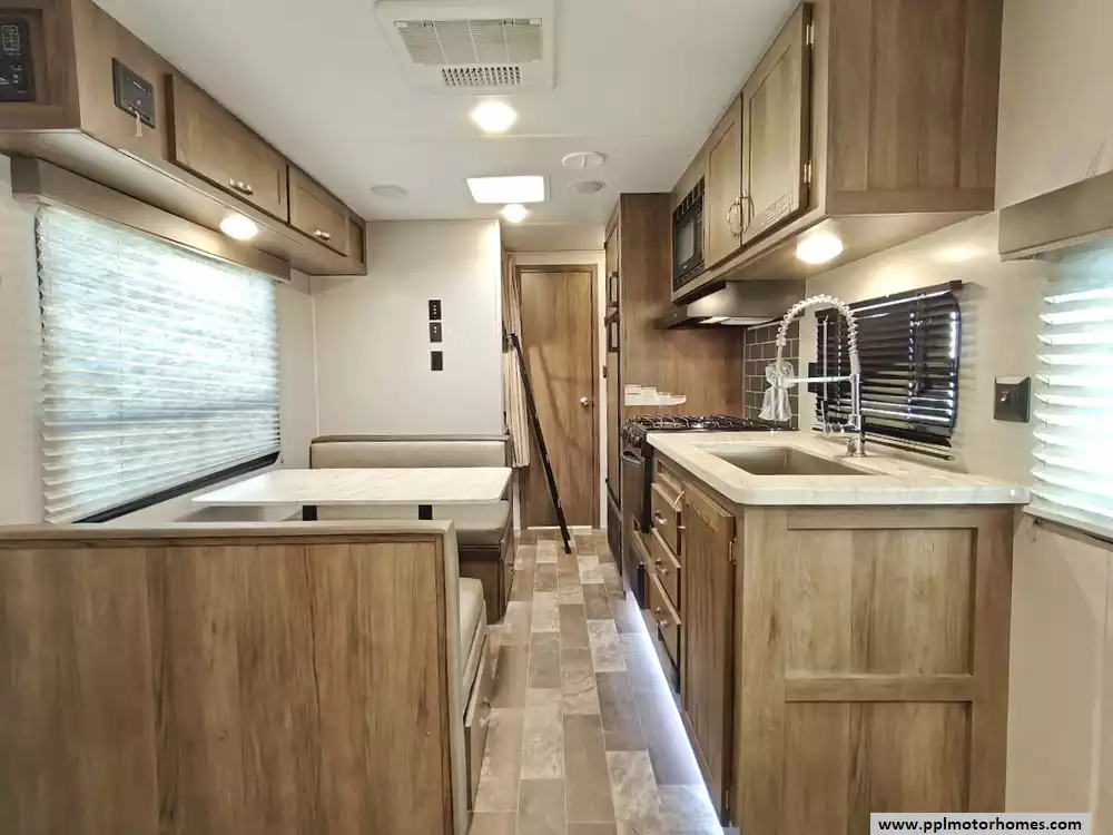 The middle section comprises the main living space. One side features a large booth dinette (which converts into a sleeper) with storage drawers underneath, and a jackknife sofa for additional sleeping. The kitchen area across from it is equipped with a three-burner range and oven, a microwave, an undermounted farmhouse sink, and a double-door refrigerator.