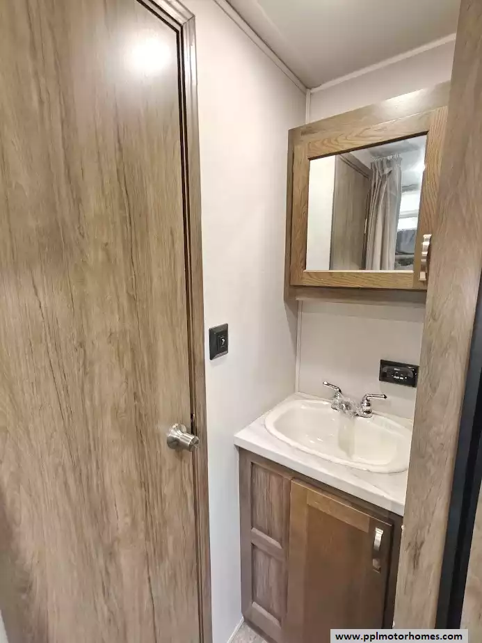 An electric power awning with LED lights is a standard feature, providing a comfortable outdoor living space.