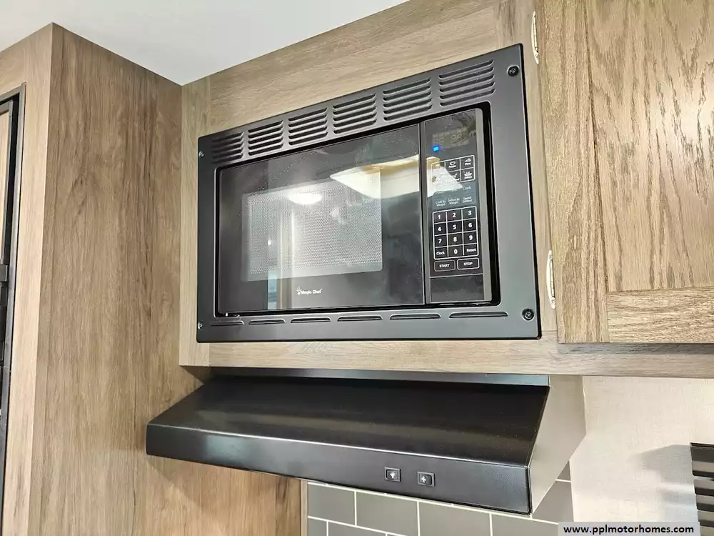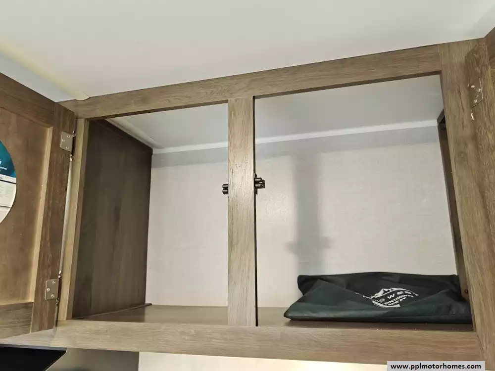 Ample storage is available throughout the RV, including overhead cabinets, a large pantry, and a fully finished exterior pass-through storage compartment.