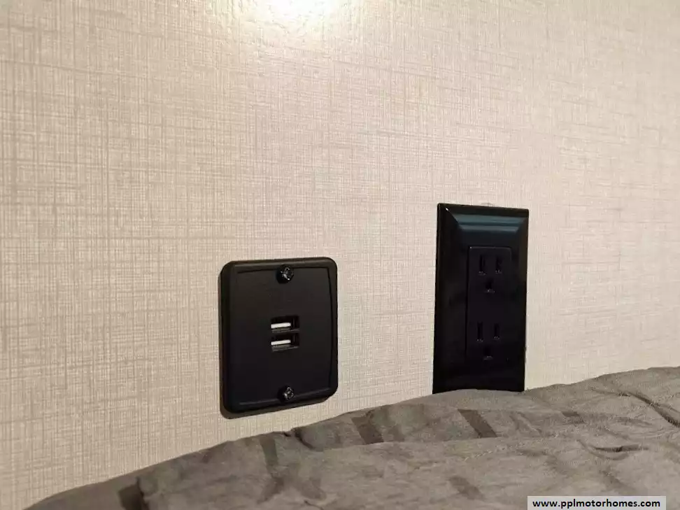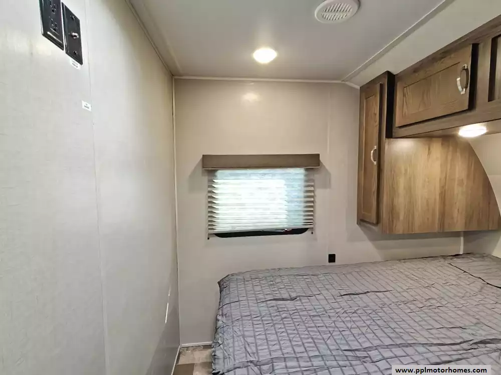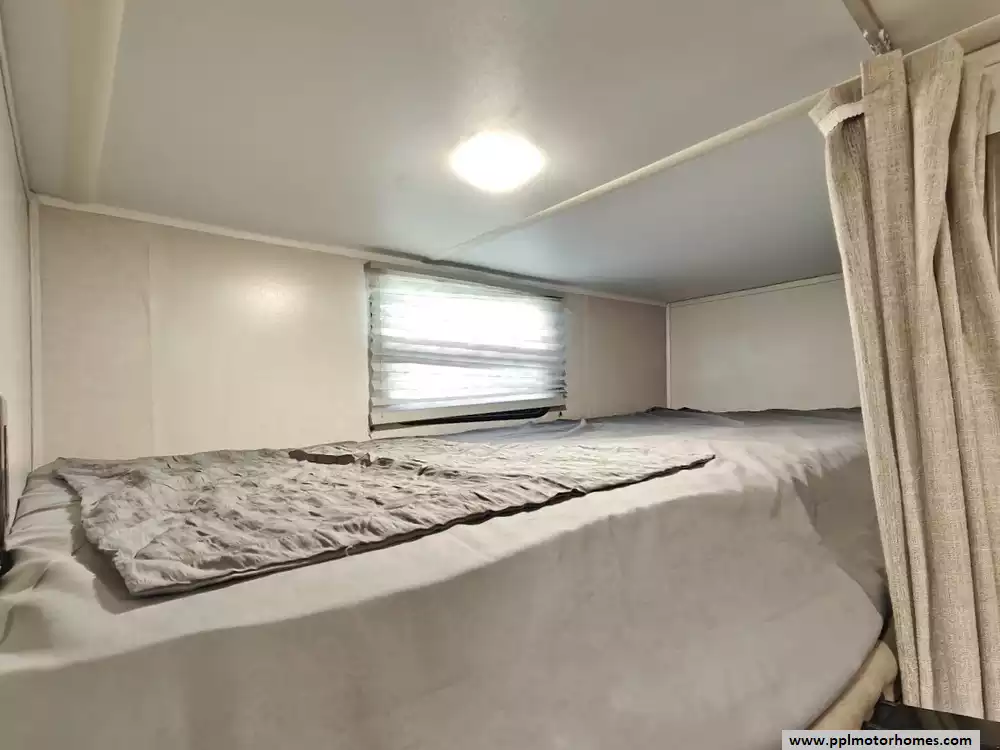 A private master bedroom is located at the front of the trailer. It features a bed, with nightstands, charging ports, and wardrobe storage on either side.