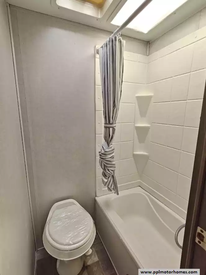 The back of the RV is dedicated to a set bunks. Adjacent is the full bathroom, which includes a foot-flush toilet, a sink, and a tub/shower with a skylight.