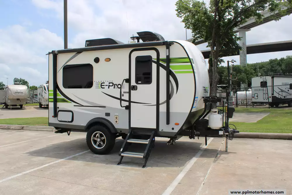 This 2020 Flagstaff E-Pro 15TB is a compact and lightweight travel trailer designed for adventurous couples or solo travelers seeking off-grid capabilities without sacrificing comfort. Features Include...Electric Tongue Jack, 1 Ducted Air Conditioner, Single Door Gas/110v Dometic Refrigerator, Automatic Main Awning, Outside Speakers, TV, Outside Shower, Convection Microwave, and 3 Burner Range. The 2020 Flagstaff E-Pro E15TB stands out for its blend of lightweight design, off-road readiness, and comfortable amenities, making it an excellent choice for travelers seeking adventure without compromising on comfort.