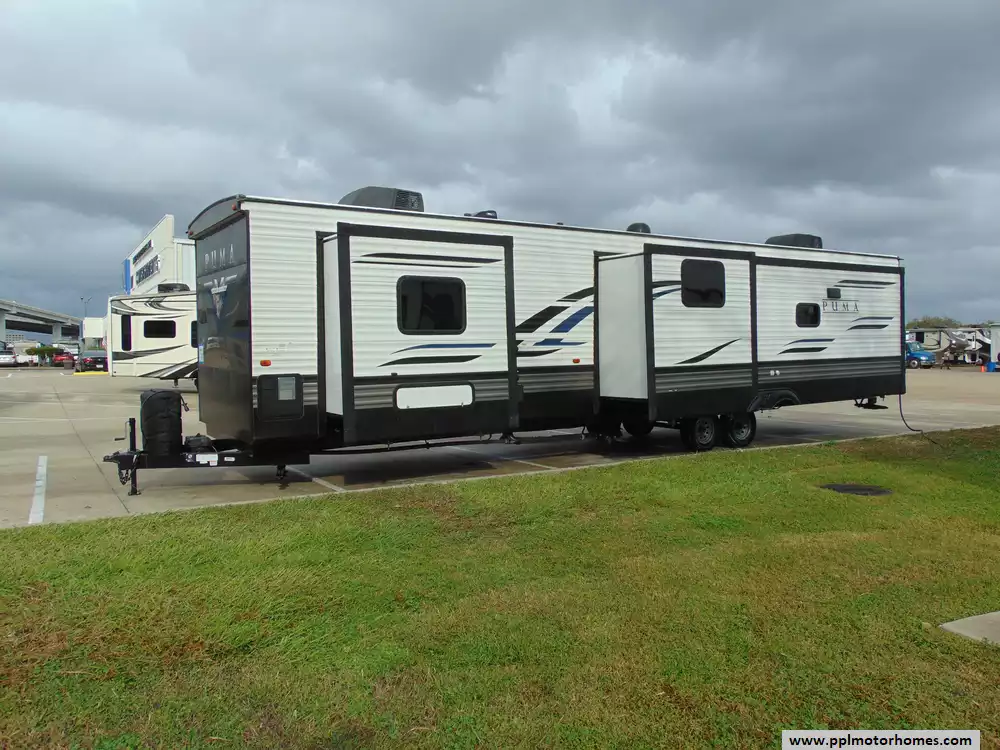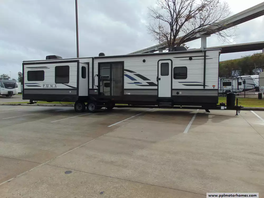 This 2020 Palomino Puma 38RLB is a spacious and luxurious travel trailer,perfect for families or couples seeking the comfort of home while on the road.This is one of the larger models in the Puma lineup,providing ample room for comfortable living. Features Include...4 Slide-outs, 1 Non-Ducted And 1 Ducted Air Conditioner, Double Door 110v Residential Everchill Refrigerator, In-Fridge Ice Maker, Automatic Main Awning,Washer/Dryer Connections, Outside Speakers, 2 TVs, Outside Shower, Fireplace,Central Vacuum,Microwave,3 Burner Range,and Oven.This is an excellent choice for those who want a roomy,feature-rich home away from home.