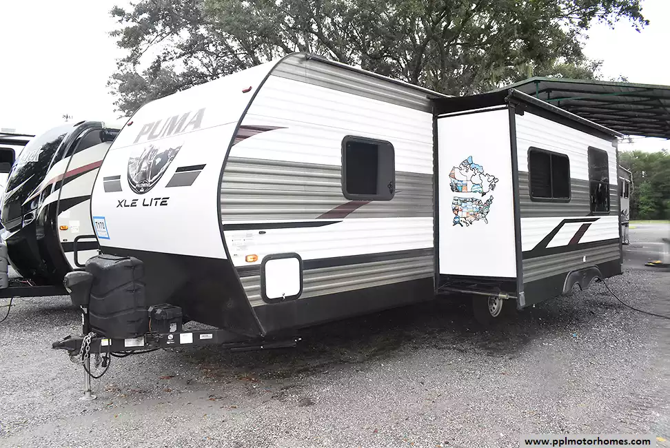 This 2020 Palomino Puma Xle Series 25RBSC has an Electric Tongue Jack, 1 Slide-out, 1 Ducted Air Conditioner, Double Door 12v Everchill Refrigerator, Automatic Main Awning, Outside Speakers, DVD Player, Outside Shower, Fireplace, Microwave, 3 Burner Range, Oven