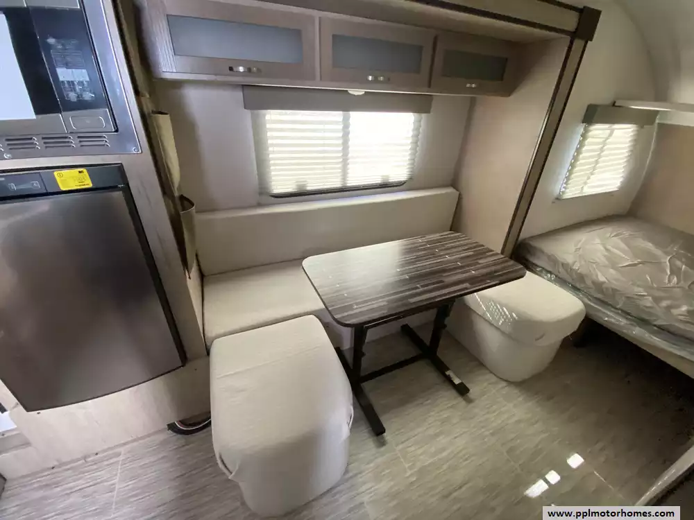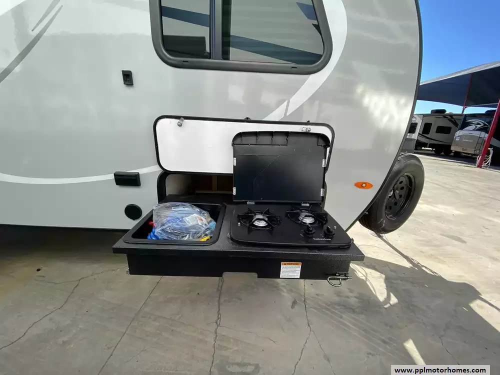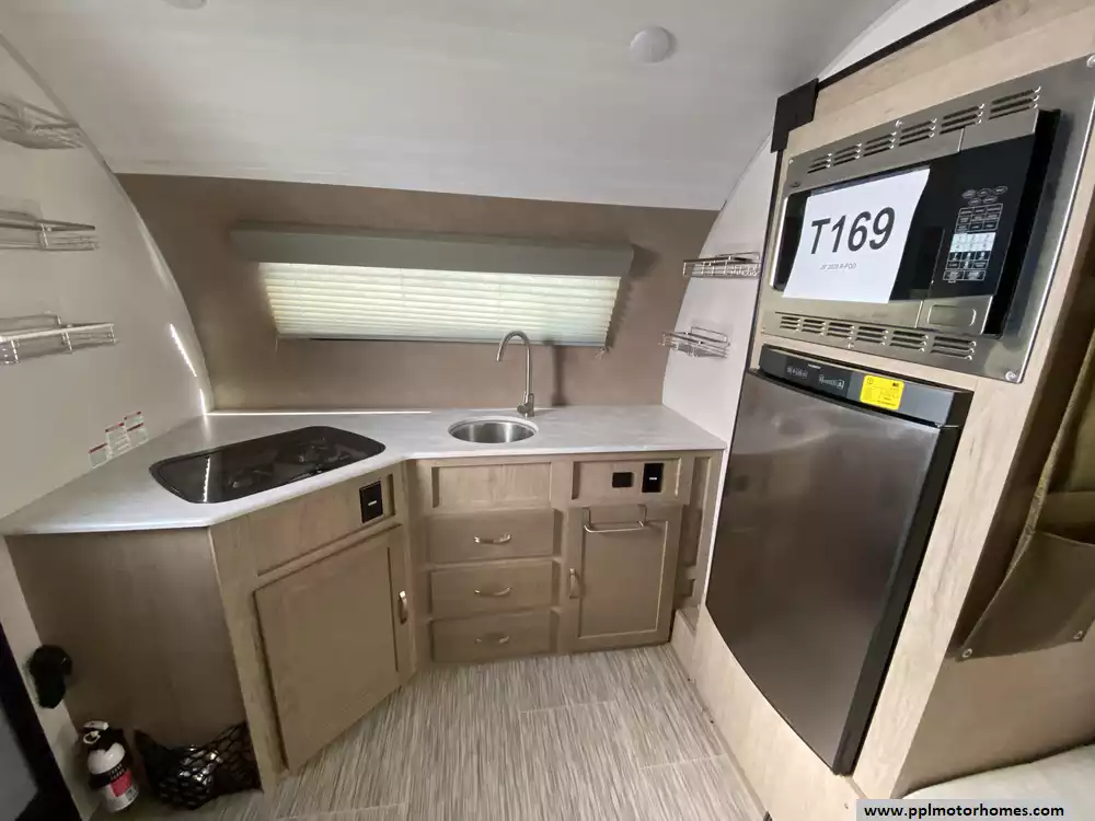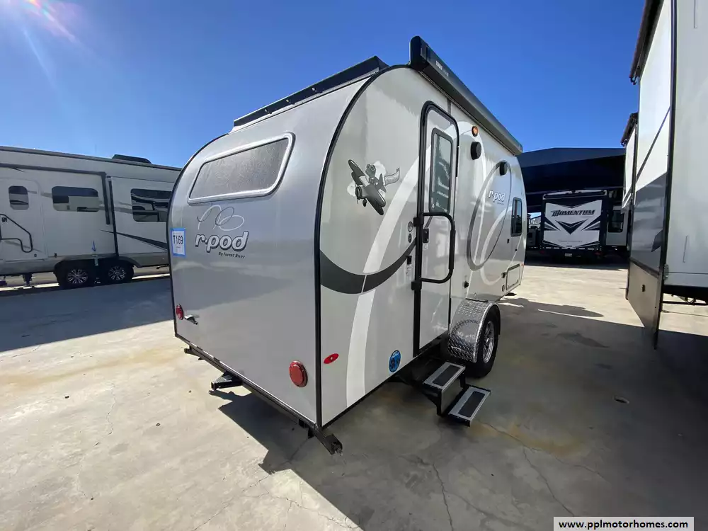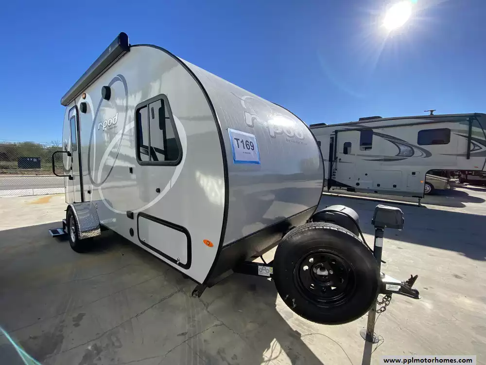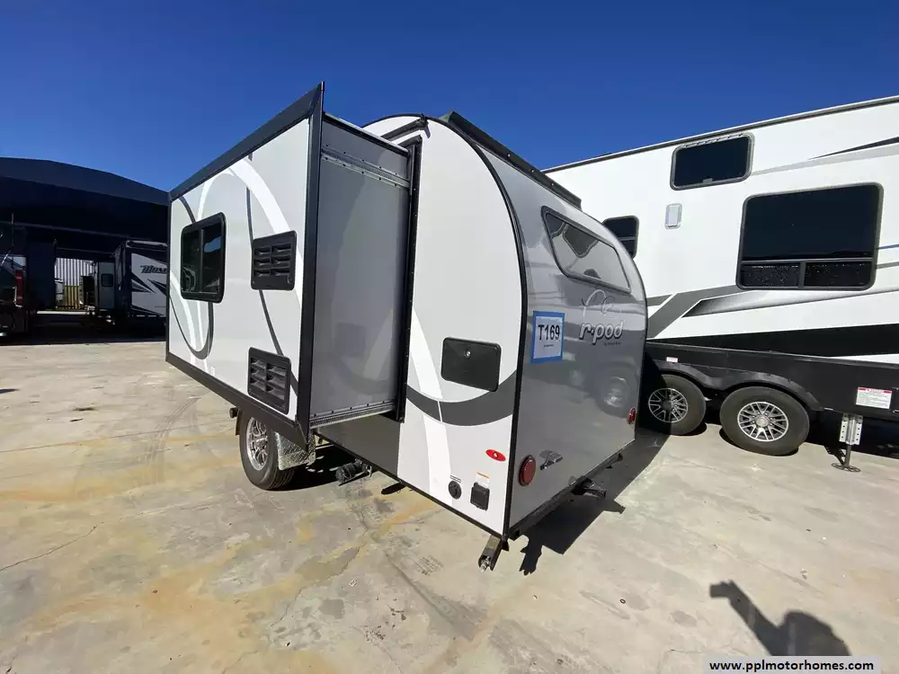 This 2020 R-Pod 179 has an Electric Tongue Jack, 1 Slide-out, 1 Non-Ducted Air Conditioner, Single Door Gas/110v Dometic Refrigerator, Automatic Main Awning, Outside Speakers, TV, Outdoor Grill, Outside Shower, Convection Microwave, 2 Burner Range